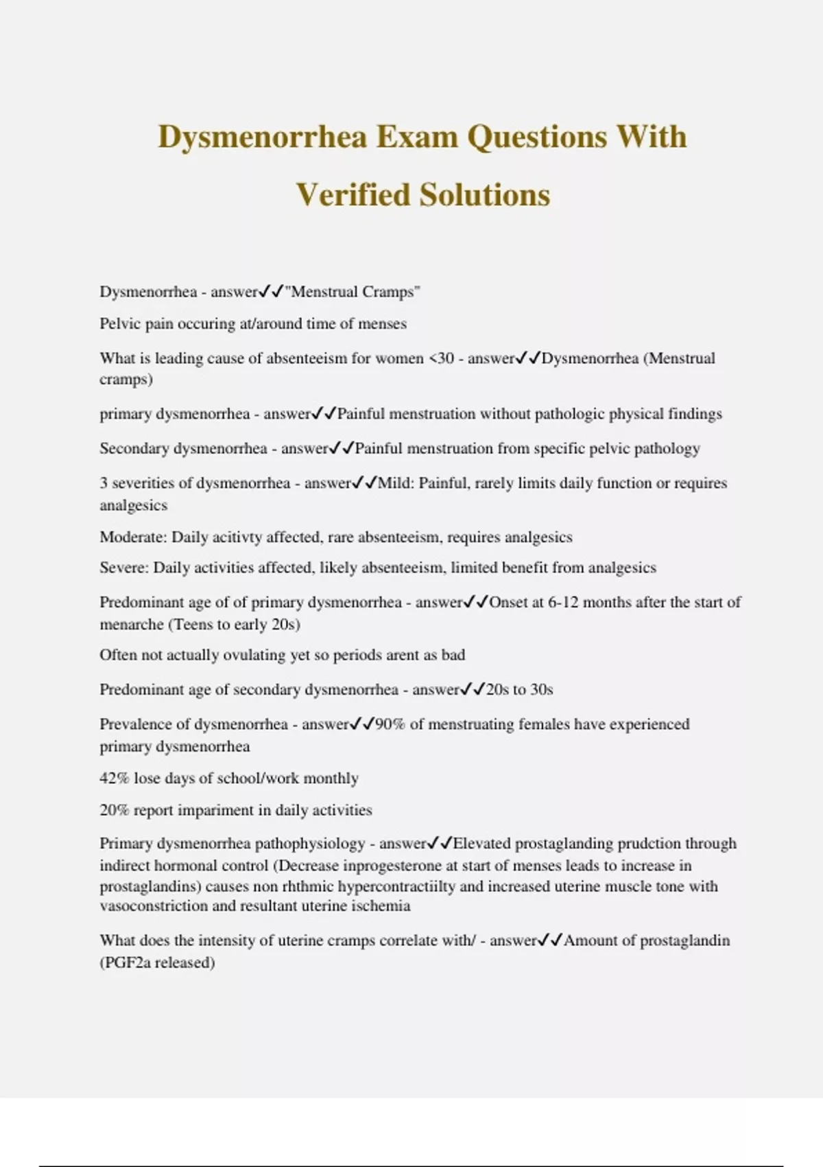 Dysmenorrhea Exam Questions With Verified Solutions Dysmenorrhea - answer"Menstrual Cramps" Pelvic pain occuring at/around time of menses What is leading cause of absenteeism for women 30 - answerDysmenorrhea (Menstrual cramps) primary dysmenorrhea - answerPainful menstruation without pathologic physical findings Secondary dysmenorrhea - answerPainful menstruation from specific pelvic pathology 3 severities of dysmenorrhea - answerMild: Painful, rarely limits daily function or requires analgesics Moderate: Daily acitivty affected, rare absenteeism, requires analgesics Severe: Daily activities affected, likely absenteeism, limited benefit from analgesics Predominant age of of primary dysmenorrhea - answerOnset at 6-12 months after the start of menarche (Teens to early 20s) Often not actually ovulating yet so periods arent as bad Predominant age of secondary dysmenorrhea - answer20s to 30s Prevalence of dysmenorrhea - answer90% of menstruating females have experienced primary dysmenorrhea 42% lose days of school/work monthly 20% report impariment in daily activities Primary dysmenorrhea pathophysiology - answerElevated prostaglanding prudction through indirect hormonal control (Decrease inprogesterone at start of menses leads to increase in prostaglandins) causes non rhthmic hypercontractiilty and increased uterine muscle tone with vasoconstriction and resultant uterine ischemia What does the intensity of uterine cramps correlate with/ - answerAmount of prostaglandin (PGF2a released)