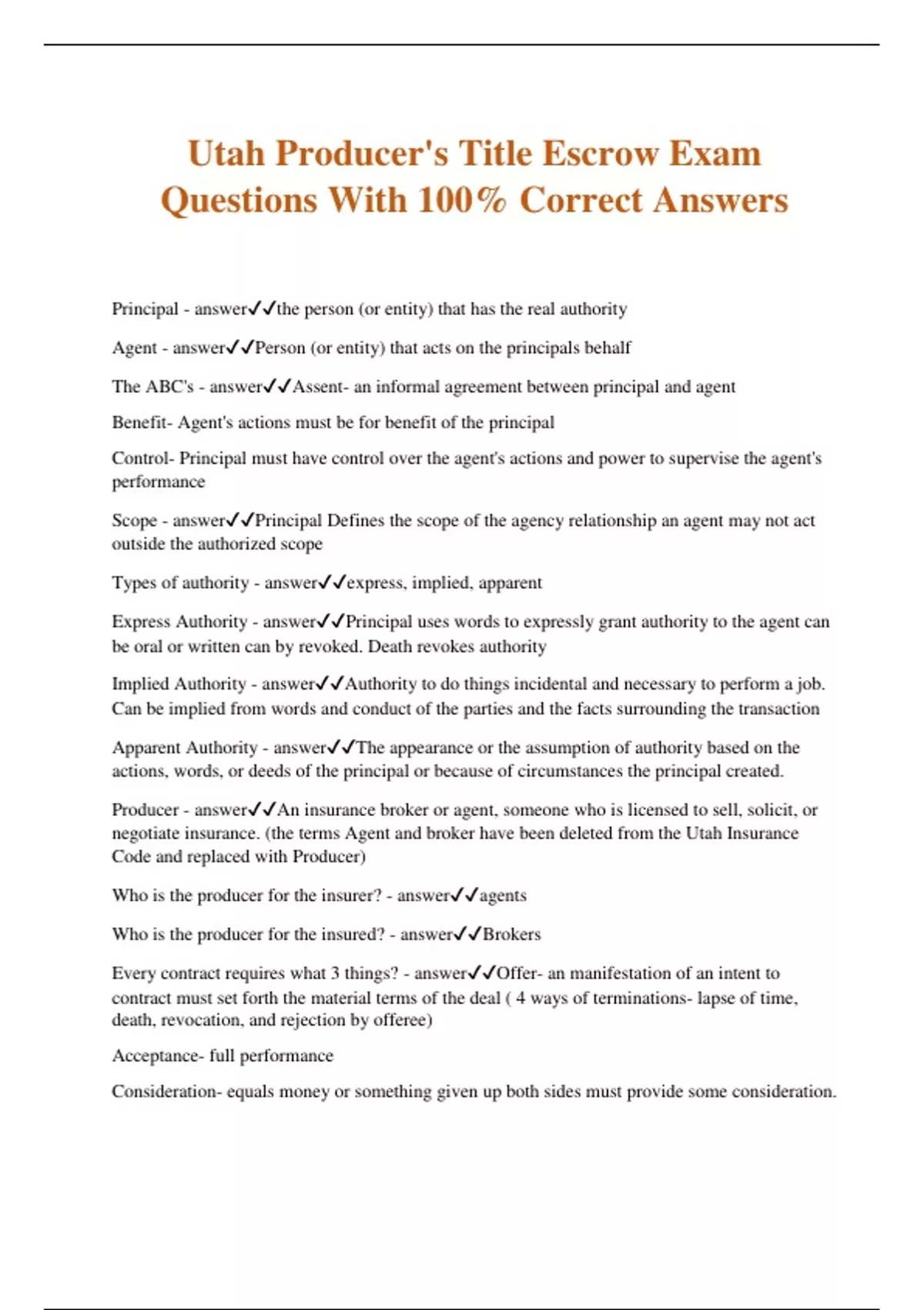 Utah Producer's Title Escrow Exam Questions With 100% Correct Answers Principal - answerthe person (or entity) that has the real authority Agent - answerPerson (or entity) that acts on the principals behalf The ABC's - answerAssent- an informal agreement between principal and agent Benefit- Agent's actions must be for benefit of the principal Control- Principal must have control over the agent's actions and power to supervise the agent's performance Scope - answerPrincipal Defines the scope of the agency relationship an agent may not act outside the authorized scope Types of authority - answerexpress, implied, apparent Express Authority - answerPrincipal uses words to expressly grant authority to the agent can be oral or written can by revoked. Death revokes authority Implied Authority - answerAuthority to do things incidental and necessary to perform a job. Can be implied from words and conduct of the parties and the facts surrounding the transaction Apparent Authority - answerThe appearance or the assumption of authority based on the actions, words, or deeds of the principal or because of circumstances the principal created. Producer - answerAn insurance broker or agent, someone who is licensed to sell, solicit, or negotiate insurance. (the terms Agent and broker have been deleted from the Utah Insurance Code and replaced with Producer) Who is the producer for the insurer? - answeragents Who is the producer for the insured? - answerBrokers Every contract requires what 3 things? - answerOffer- an manifestation of an intent to contract must set forth the material terms of the deal ( 4 ways of terminations- lapse of time, death, revocation, and rejection by offeree) Acceptance- full performance Consideration- equals money or something given up both sides must provide some consideration.