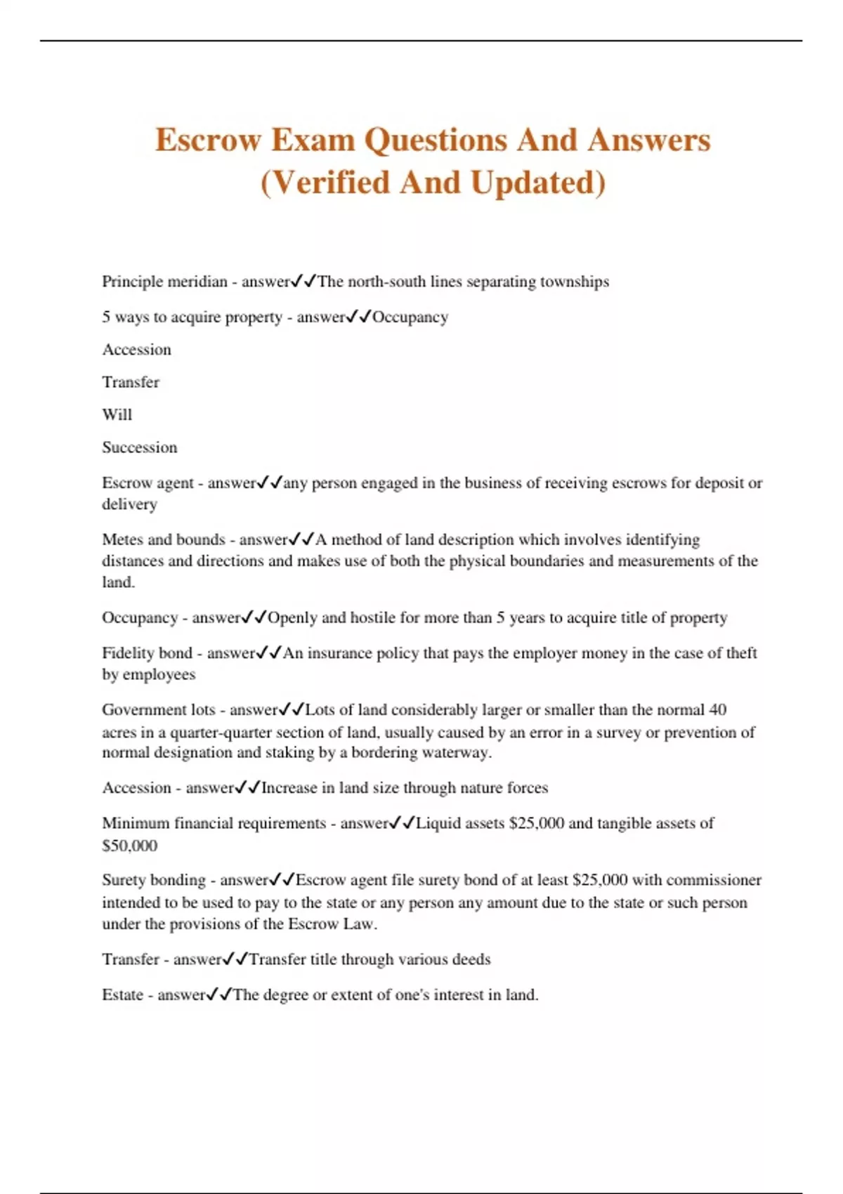 Escrow Exam Questions And Answers (Verified And Updated) Principle meridian - answerThe north-south lines separating townships 5 ways to acquire property - answerOccupancy Accession Transfer Will Succession Escrow agent - answerany person engaged in the business of receiving escrows for deposit or delivery Metes and bounds - answerA method of land description which involves identifying distances and directions and makes use of both the physical boundaries and measurements of the land. Occupancy - answerOpenly and hostile for more than 5 years to acquire title of property Fidelity bond - answerAn insurance policy that pays the employer money in the case of theft by employees Government lots - answerLots of land considerably larger or smaller than the normal 40 acres in a quarter-quarter section of land, usually caused by an error in a survey or prevention of normal designation and staking by a bordering waterway. Accession - answerIncrease in land size through nature forces Minimum financial requirements - answerLiquid assets $25,000 and tangible assets of $50,000 Surety bonding - answerEscrow agent file surety bond of at least $25,000 with commissioner intended to be used to pay to the state or any person any amount due to the state or such person under the provisions of the Escrow Law. Transfer - answerTransfer title through various deeds Estate - answerThe degree or extent of one's interest in land. Freehold estate - answerAn estate in land in which ownership is for an indeterminate length of time Will - answerTransferring title upon death Probate not required if <$150,000 and 40 days had elapsed since death Background checks - answerAll stockholders, officers, directors, managers, and employees must have background checks performed by the department Fee simple absolute - answerAn estate in land that provides the owner with a complete set of legal rights, limited only by the powers of government Succession - answerTransfer property if intestate Trust - answerThe right of property, real or personal, held by one party for the benefit of another Fee Simple Defeasible - answerSpecific conditions or restrictions are placed on the transferability of the property Constructive notice - answerThe world at large may learn that the agreement exists because it is available for any person to see Abstract of title - answerA history of the ownership of a parcel of land which lists transfers of title, rights, and liabilities. Responsibilities of escrow holder - answer- Are limited and restricted as to what they may do - Are not arbitrators to resolve disputes and must remain neutral - Receive instructions from principals to perform specific duties - Ensure all documents required are present - Must account for all required monies Requirements for deed to be valid? - answerWritten Conveyance Property description Competent grantor Grantee Life estate - answerAn estate in which ownership exists only during the term of the life of a named person Estate in Reversion - answerAn estate that comes back to the original grantor after a person dies Joint tenancy grant deed - answerConveys title to those who are acquiring title to property and who desire a surviving spouse upon the death of the other to receive the interest of the decedent (and without the need for a full probate) The character of property interests and private property rights in California can be traced back to - answerthe Spanish Interspousal deed - answerUsed for the transfer of an interest in real property from one spouse to another California's property ownership concepts have their roots in - answerEnglish common law Community property with right of survivorship deed - answerUsed when tax considerations of the surviving spouse are important to the parties Quitclaim deed - answerTransfers only whatever interest the grantor has in the property Warranty deed - answerA deed in which the grantor makes formal assurance as to quality of title Trust deed - answerUsed by a lender to identify and secure the collateral (real property) being pledged by a borrower for obtaining a loan. Signed, notarized, and noted Impound account - answerThe lender requires the borrower to make regular deposits, and pays the expenses out of the account Beneficiary statement - answerA statement of the unpaid balance of a loan and the condition of the debt Taking title subject to - answerBuyer and the seller agree that the buyer can assume the seller's existing loan without the buyer actually applying to or being approved by the seller's lender Right to reinstate the loan - answerBorrower's rights and the procedures required to bring the loan current in the event of a default All Inclusive deed of trust - answerA wraparound loan arrangement whereby a Deed of Trust is used in place of a mortgage. Probate is NOT required if title was held as - answerjoint tenants An all-inclusive deed of trust is - answertypically acceptable to existing lenders In order to be valid, deeds must be in writing, include the property description, contain conveying language, identify a grantee, and - answerbe signed by a competent grantor