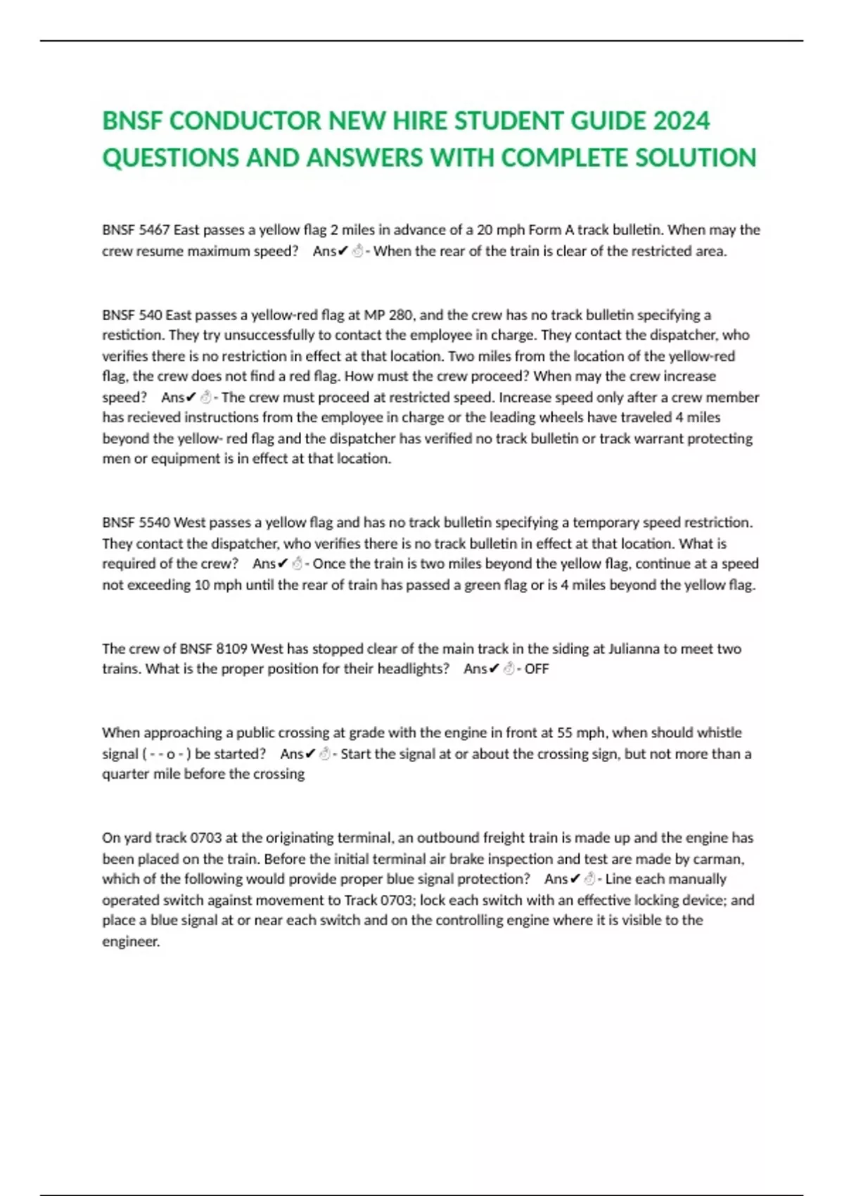 BNSF CONDUCTOR NEW HIRE STUDENT GUIDE 2024 QUESTIONS AND ANSWERS WITH COMPLETE SOLUTION