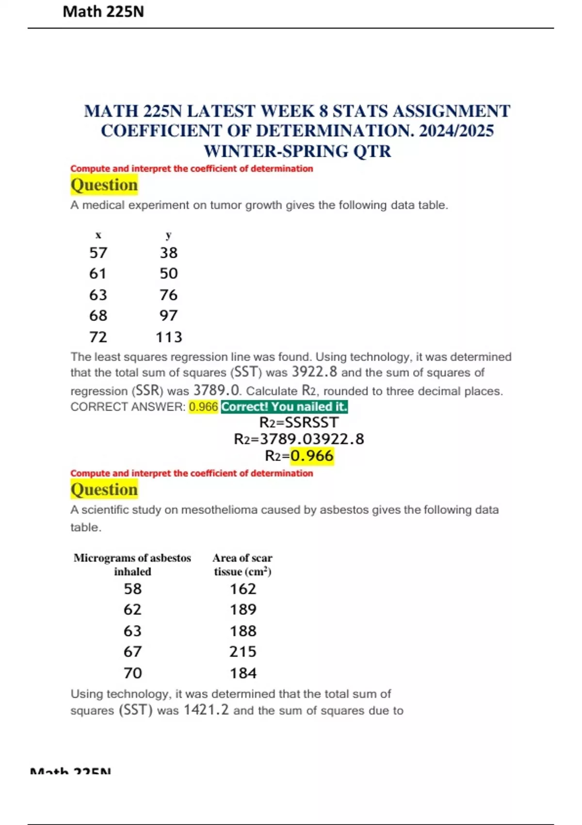 MATH 225N LATEST WEEK 8 STATS ASSIGNMENT COEFFICIENT OF DETERMINATION. 2024/2025 WINTER-SPRING QTR