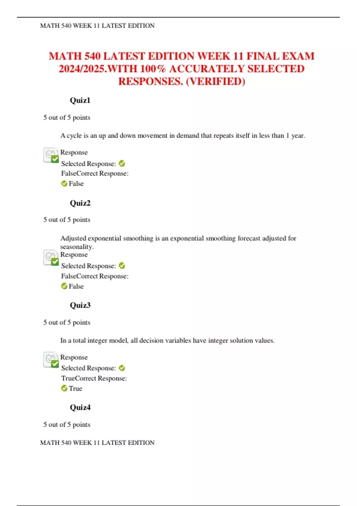 MATH 540 LATEST EDITION WEEK 11 FINAL EXAM 2024/2025.WITH 100% ACCURATELY SELECTED RESPONSES. (VERIFIED)