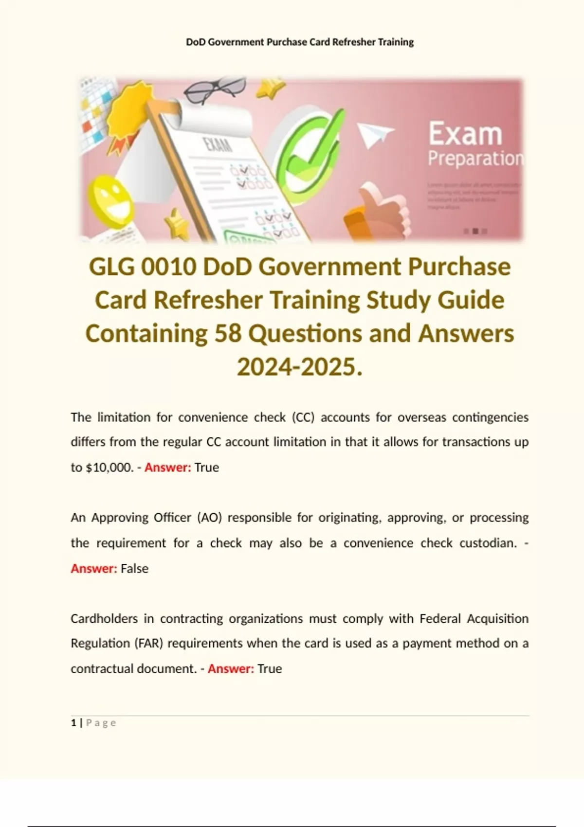 GLG 0010 DoD Government Purchase Card Refresher Training Study Guide Containing 58 Questions and Answers .