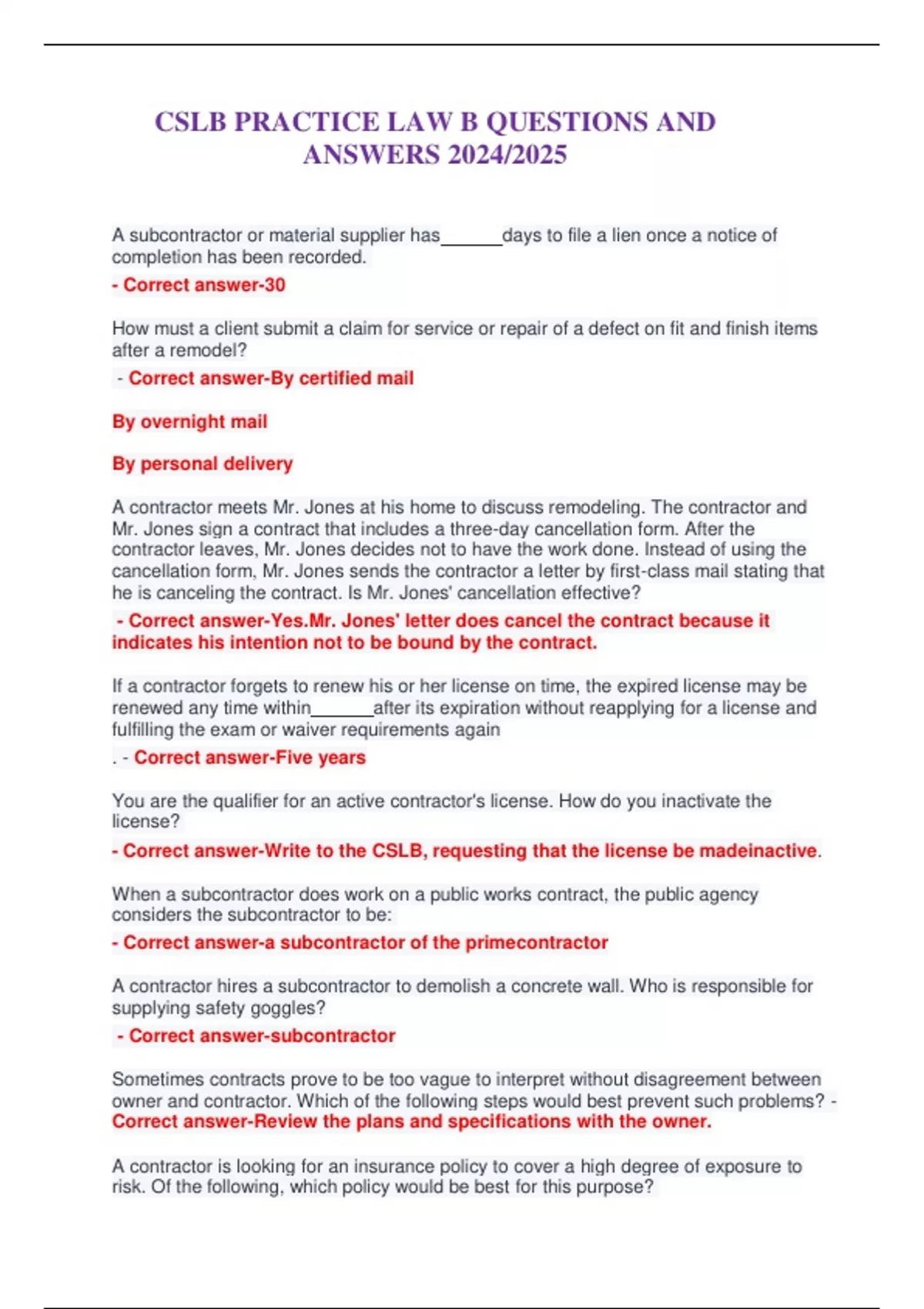 CSLB PRACTICE LAW B QUESTIONS AND ANSWERS 2024/2025