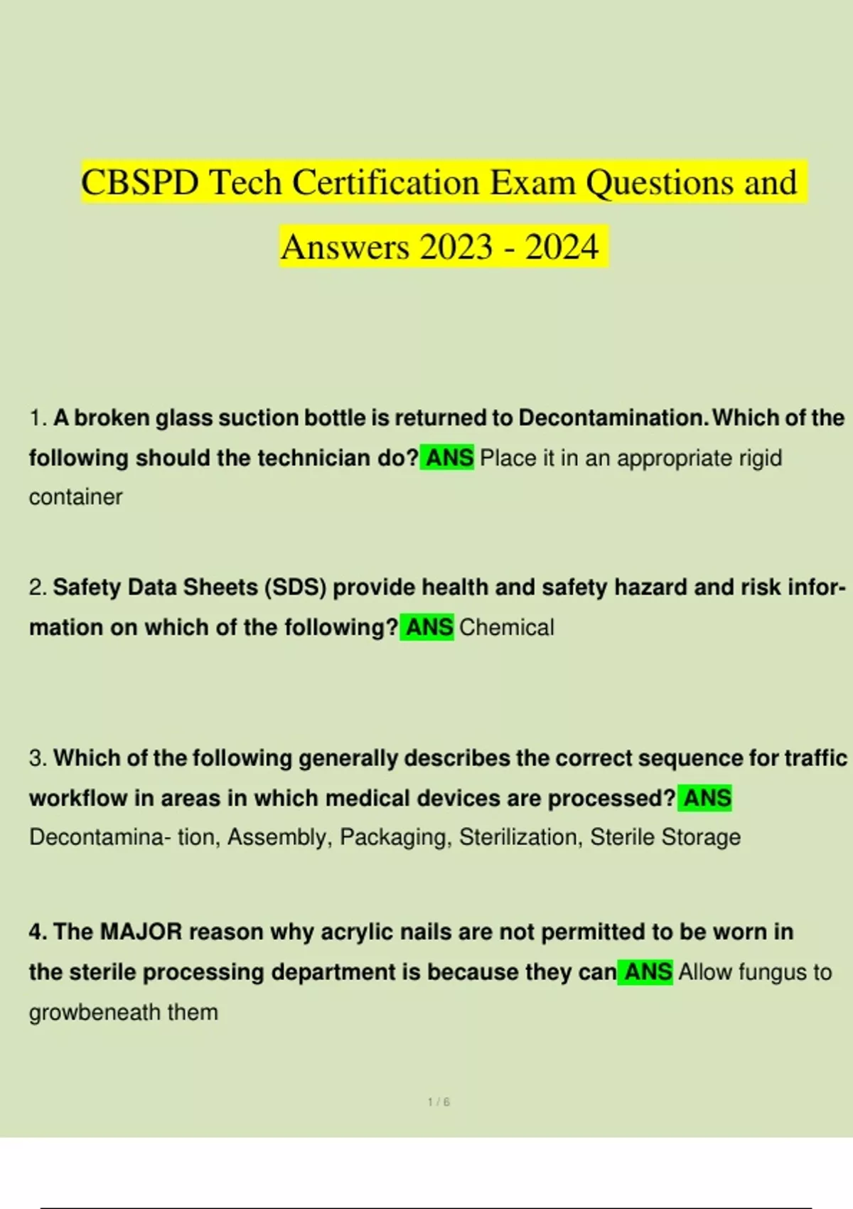 1. A broken glass suction bottle is returned to Decontamination.Which of the following should the technician do? ANS Place it in an appropriate rigid container 2. Safety Data Sheets (SDS) provide health and safety hazard and risk information on which of the following? ANS Chemical 3. Which of the following generally describes the correct sequence for traffic workflow in areas in which medical devices are processed? ANS Decontamina- tion, Assembly, Packaging, Sterilization, Sterile Storage 4. The MAJOR reason why acrylic nails are not permitted to be worn in the sterile processing department is because they can ANS Allow fungus to growbeneath them 2 / 6 5. Which of the following agencies would approve the disinfectants used on floors and walls in the Sterile Processing Department? ANS EnvironmentalProtection Agency (EPA) 6. Every healthcare facility has an organizational structure, or chart, that outlines ANS Departmental authority relationships 7. "Clean to dirty" is a sterile processing department term used to describeANS Work flow 8. What are the major physical areas of a typical Sterile Processing Department? ANS Decontamination, Assembly, Preparation and Packaging, Steriliza-tion, and Sterile Storage 9. Loose fitting clothing and jewelry should NOT be worn in sterile processing because it ANS Can get caught in moving equipment 10. Hair coverings are REQUIRED ANS In all areas of the department 11. Decontamination procedures ANS Reduce contamination to permit 3 / 6 reprocessedmedical devices to be sterilized 12. A patient contracts an infection from an improperly sterilized surgical instrument.This is an example of ANS A healthcare acquired infection