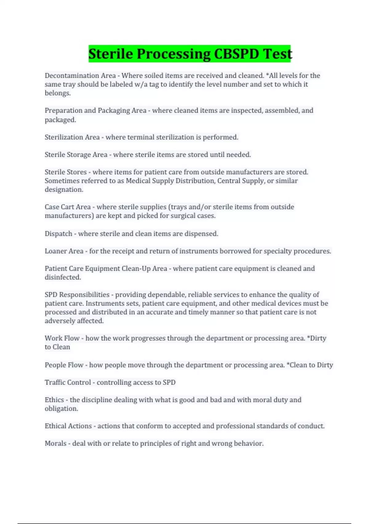 Decontamination Area - Where soiled items are received and cleaned. *All levels for the same tray should be labeled w/a tag to identify the level number and set to which it belongs. Preparation and Packaging Area - where cleaned items are inspected, assembled, and packaged. Sterilization Area - where terminal sterilization is performed. Sterile Storage Area - where sterile items are stored until needed. Sterile Stores - where items for patient care from outside manufacturers are stored. Sometimes referred to as Medical Supply Distribution, Central Supply, or similar designation. Case Cart Area - where sterile supplies (trays and/or sterile items from outside manufacturers) are kept and picked for surgical cases. Dispatch - where sterile and clean items are dispensed. Loaner Area - for the receipt and return of instruments borrowed for specialty procedures. Patient Care Equipment Clean-Up Area - where patient care equipment is cleaned and disinfected. SPD Responsibilities - providing dependable, reliable services to enhance the quality of patient care. Instruments sets, patient care equipment, and other medical devices must be processed and distributed in an accurate and timely manner so that patient care is not adversely affected. Work Flow - how the work progresses through the department or processing area. *Dirty to Clean People Flow - how people move through the department or processing area. *Clean to Dirty Traffic Control - controlling access to SPD Ethics - the discipline dealing with what is good and bad and with moral duty and obligation. Ethical Actions - actions that conform to accepted and professional standards of conduct. Morals - deal with or relate to principles of right and wrong behavior. Unethical Professional Conduct - failure to conform to moral standards or policies. Professional Ethics - principles of conduct governing an individual or group. American Medical Association (AMA) - the most important organization related to healthcare ethics. Regulation - a principle, rule, or law designed to control or govern behavior. Agencies that issue regulations - EPA, FDA, OSHA and State health departments Standard - an established norm determined by opinion, authority, research and/or theory. Recommended Practices - statements of sound principles of practice based on scientific data and opinions of experts. Agencies that set standards - AAMI, CDC Examples of recommended practices - documents developed by IAHCSMM, SGNA, AORN Environmental Protection Agency (EPA) - Registers and regulates environmental disinfectants, controls emissions into the air and water, regulates the manufacture and sale of EO gas Food and Drug Administration (FDA) - regulates all medical devices. MedWatch (recalls); approves reprocessing of single use devices; require IFU (instructions for use) Function of CS/SPD - receives, cleans, decontaminates, assembles, inspects, disinfects, sterilizes reusable medical and surgical devices Sterile processing is A.K.A - Central Material Service, Sterile Processing Service, Central Service, Sterile Processing Department Two groups that certify - CBSPD (Cerification board for sterile processing and distribution, IAHCSMM (International association of healthcare central service material management) Chain of command - chief operating officer, VP nursing, sterile processing manager, SPD lead tech, SPD processing tech, SPD inventory tech, SPD case cart tech Compliance w/a regulation is - mandatory/required by law Confidentiality - HIPAA (Health insurance portability and accountability act) the manufacturer performs ________ for a product, the facility end user performs _______. - validation; verification Occupational Safety Health Administration (OSHA) - protects workers; OSHA standards are required by law; sets occupational exposure limits for all chemicals in the workplace under mSDS (material safety data sheet); "right to know"; Emergency eyewash stations Responsible for regulating EO gas - OSHA, EPA Ergonomics - OSHA; fitting the job to the worker, prevent injuries before they occur Emergency eyewash stations - available within 10 seconds/30 meters of chemicals; handsfree; test regularly and document, 0 4 gallons of water. Government Agencies - EPA, FDA, OSHA NFPA - National Fire Protection Association Center for Disease Control and prevention (CDC) - voluntary; promotes health by preventing and controlling disease; publishes recommendations and guidelines; hand hygiene (15 second minimum); NO artificial nails; classifies medical devices according to Spaulding Spaulding Classification - Critical (exposed to sterile areas of the body; must be sterile); Semi-Critical (touches mucous membranes; recommended sterile or high level disinfected); Non Critical (touch the skin; can be cleaned or disinfected; less than high level disinfection) NFPA Blue Diamond - health hazard NFPA Red Diamond - flammability NFPA Yellow Diamond - instability NFPA White Diamond - special hazard information The Joint Commission (TJC) formally (Joint Commission on Accreditation of Healthcare Organizations (JCAHO)) - voluntary; establishes accrediting standards and conducts onsite inspections; annual competency testing Association for the Advancement of Medical Instrumentation (AAMI) - voluntary; sets standards for CS/SPD Association of peri-Operative Registered Nurses (AORN) - voluntary; develops nationally recognized standards, recommended practices and guidelines for peri-operative setting Association for Professionals in Infection Control (APIC) - voluntary; international organization dedicated to prvention and control of infections Society of Gastroenterology Nurses and Associates (SGNA) - voluntary; established standards for effective processing of flexible endoscopes Department Of Transportation (DOT) - enforces laws relating to transportation of medical wastes American National Standards Institute (ANSI) - voluntary; proposes standards to include enhancing the global competitiveness and quality