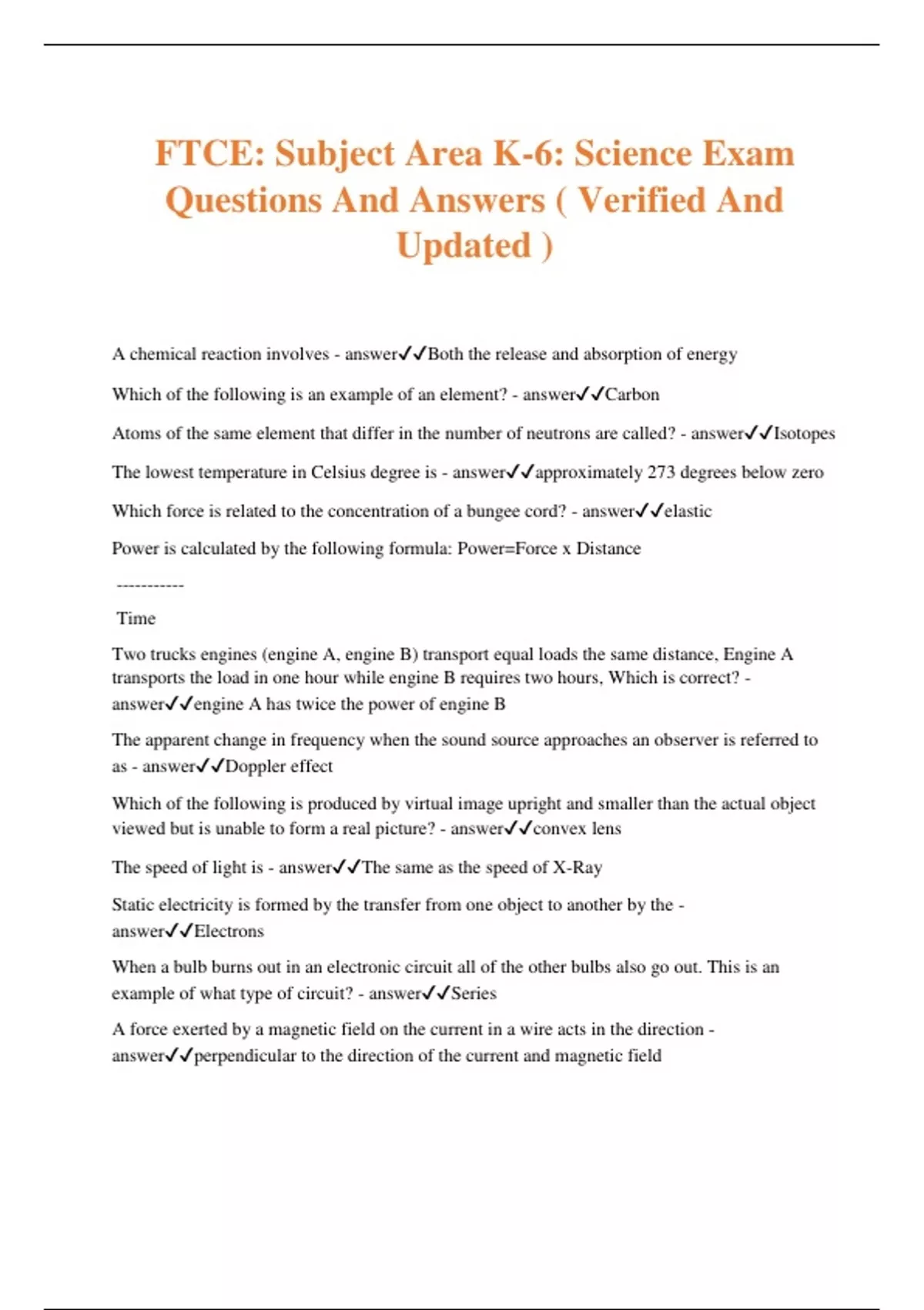 FTCE: Subject Area K-6: Science Exam Questions And Answers ( Verified And Updated )