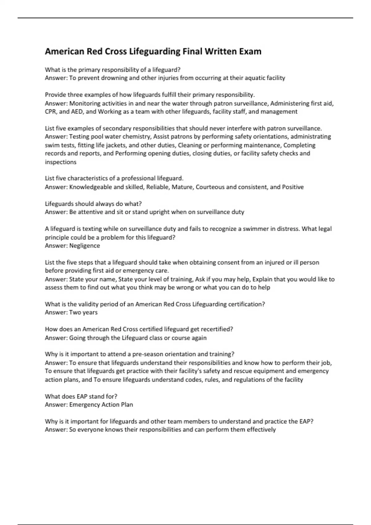 American Red Cross Lifeguarding Final Written Exam