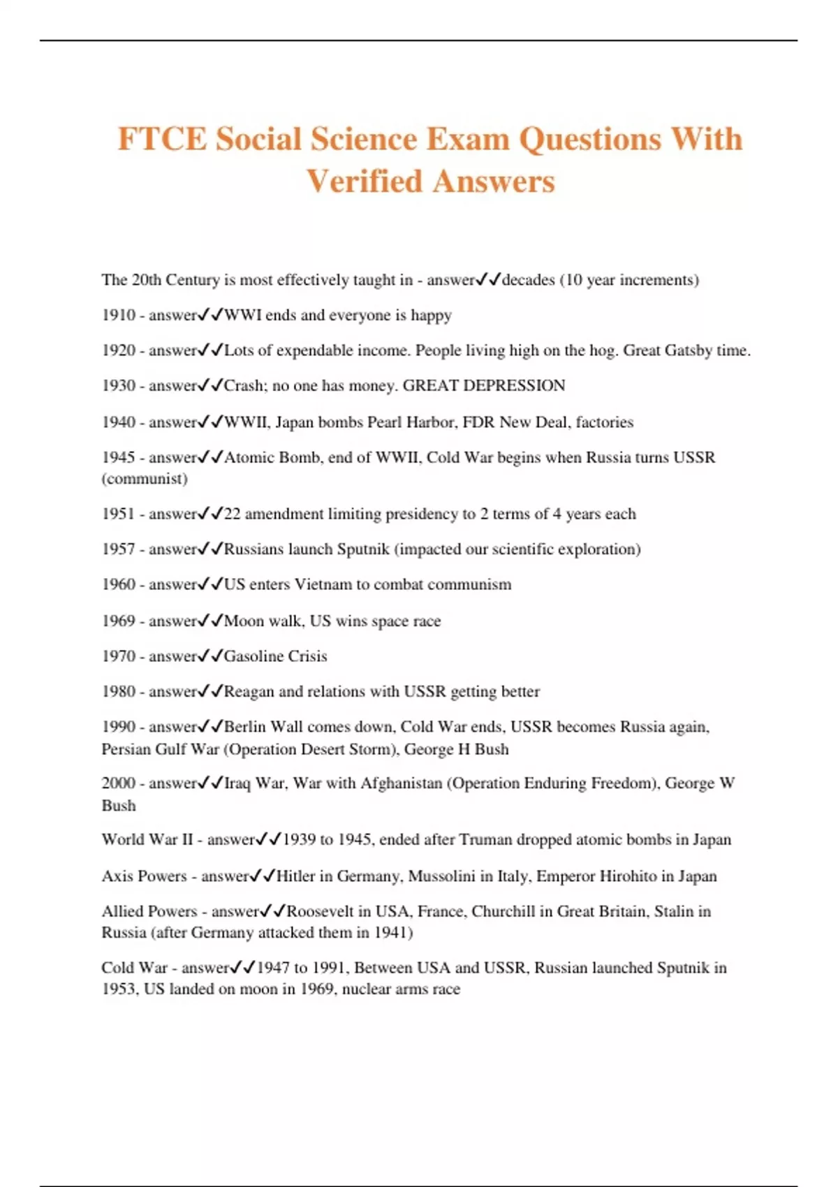 FTCE Social Science Exam Questions With Verified Answers The 20th Century is most effectively taught in - answerdecades (10 year increments) 1910 - answerWWI ends and everyone is happy 1920 - answerLots of expendable income. People living high on the hog. Great Gatsby time. 1930 - answerCrash; no one has money. GREAT DEPRESSION 1940 - answerWWII, Japan bombs Pearl Harbor, FDR New Deal, factories 1945 - answerAtomic Bomb, end of WWII, Cold War begins when Russia turns USSR (communist) 1951 - answer22 amendment limiting presidency to 2 terms of 4 years each 1957 - answerRussians launch Sputnik (impacted our scientific exploration) 1960 - answerUS enters Vietnam to combat communism 1969 - answerMoon walk, US wins space race 1970 - answerGasoline Crisis 1980 - answerReagan and relations with USSR getting better 1990 - answerBerlin Wall comes down, Cold War ends, USSR becomes Russia again, Persian Gulf War (Operation Desert Storm), George H Bush 2000 - answerIraq War, War with Afghanistan (Operation Enduring Freedom), George W Bush World War II - answer1939 to 1945, ended after Truman dropped atomic bombs in Japan Axis Powers - answerHitler in Germany, Mussolini in Italy, Emperor Hirohito in Japan Allied Powers - answerRoosevelt in USA, France, Churchill in Great Britain, Stalin in Russia (after Germany attacked them in 1941) Cold War - answer1947 to 1991, Between USA and USSR, Russian launched Sputnik in 1953, US landed on moon in 1969, nuclear arms race
