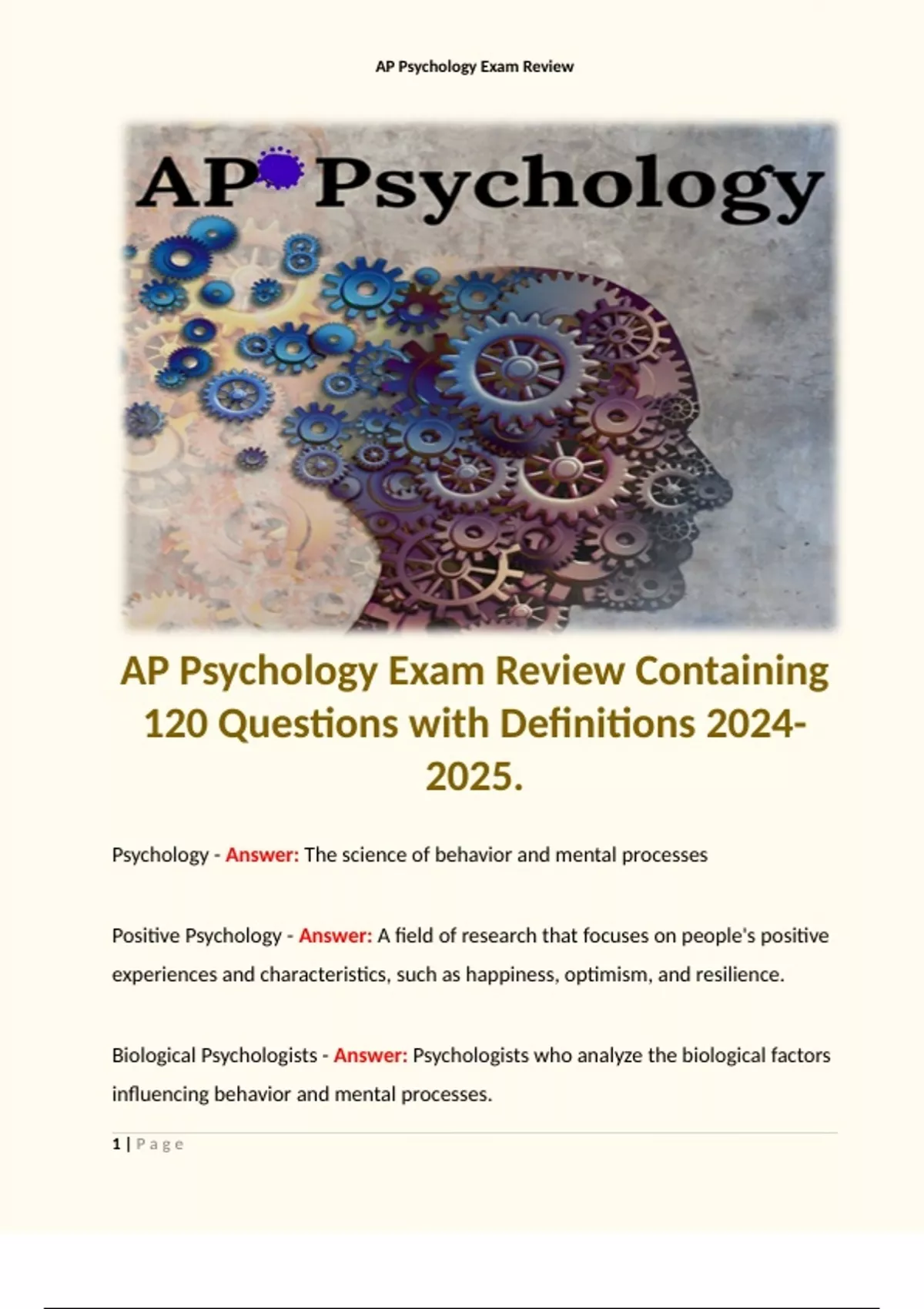 AP Psychology Exam Review Containing 120 Questions with Definitions . Terms like: Positive Psychology - Answer: A field of research that focuses on people's positive experiences and characteristics, such as happiness, optimism, and resilience