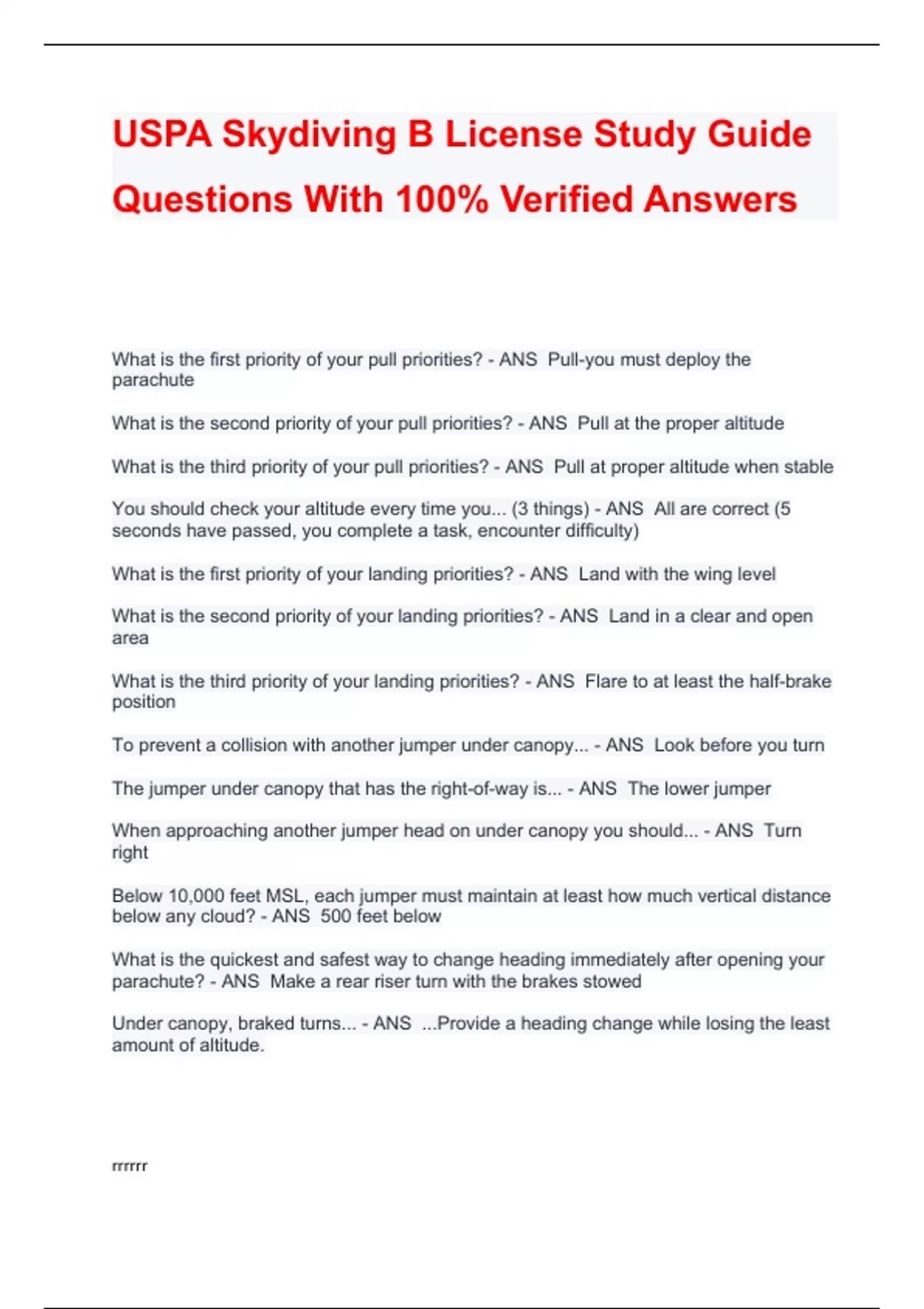 USPA Skydiving B License Study Guide Questions With 100% Verified Answers What is the first priority of your pull priorities? - ANS Pull-you must deploy the parachute What is the second priority of your pull priorities? - ANS Pull at the proper al
