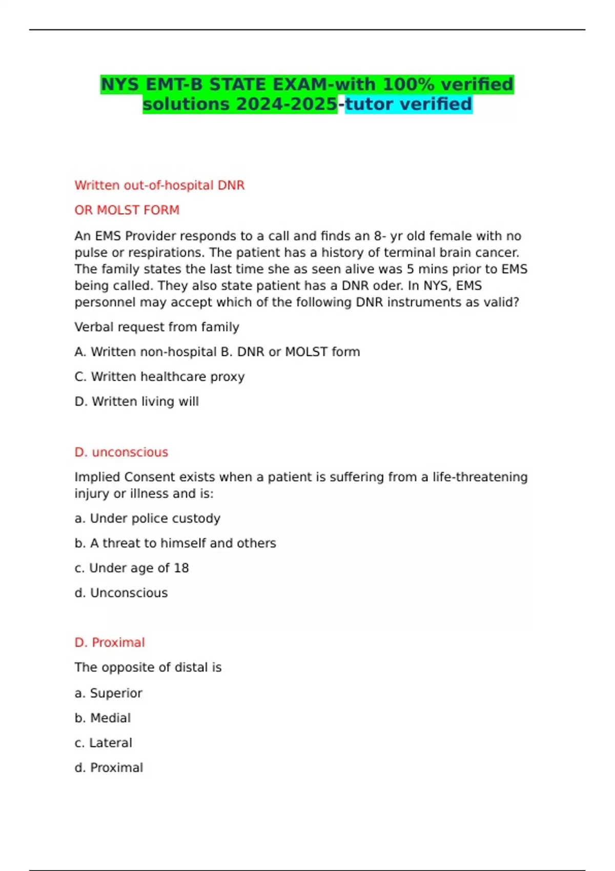 NYS EMT-B STATE EXAM-with 100% verified solutions -tutor verified