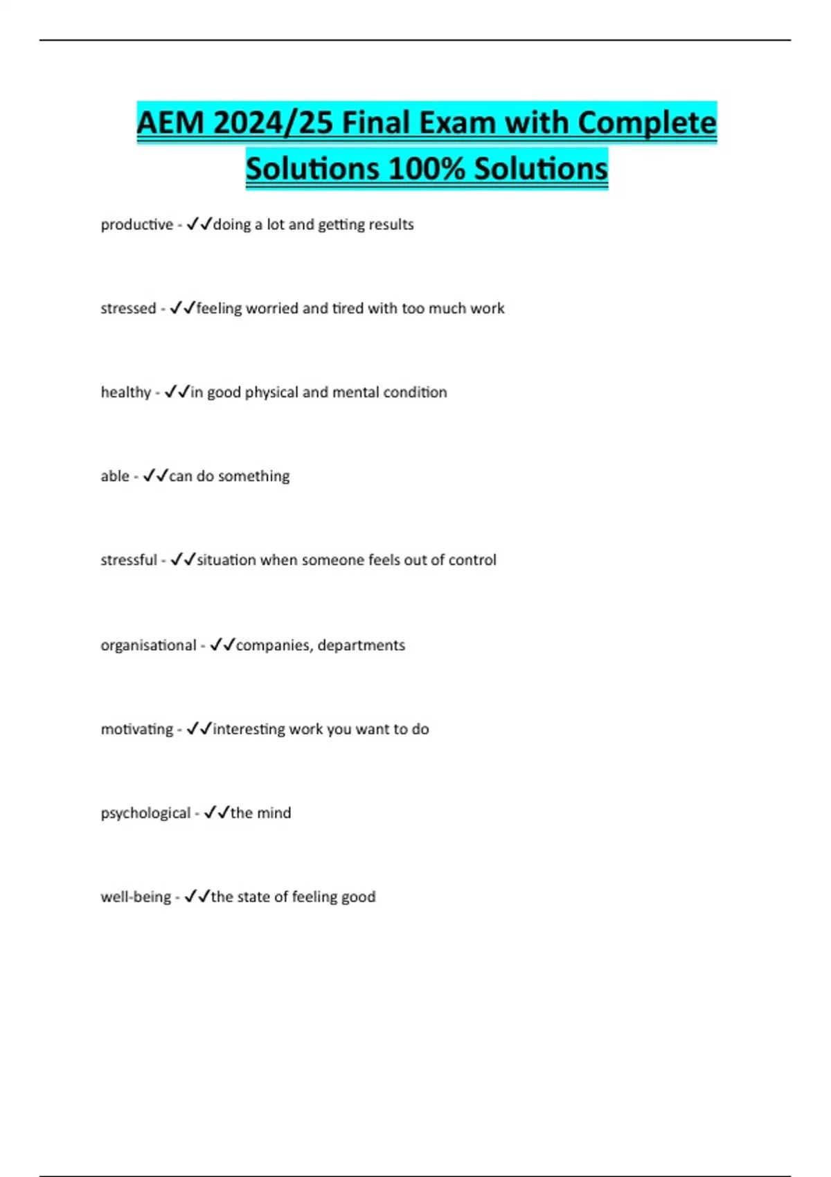 AEM 2024/25 Final Exam with Complete Solutions 100% Solutions productive - doing a lot and getting results stressed - feeling worried and tired with too much work healthy - in good physical and mental condition able - can do something stressful - situation when someone feels out of control organisational - companies, departments motivating - interesting work you want to do psychological - the mind well-being - the state of feeling good