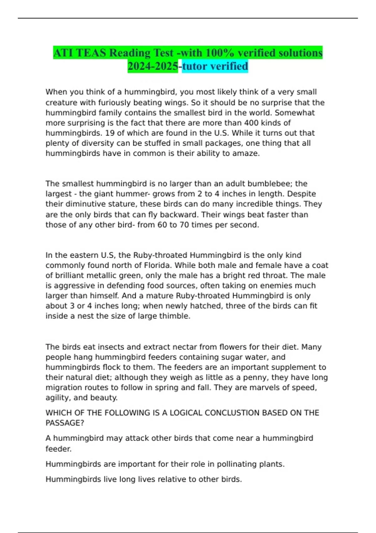 ATI TEAS Reading Test -with 100% verified solutions -tutor verified