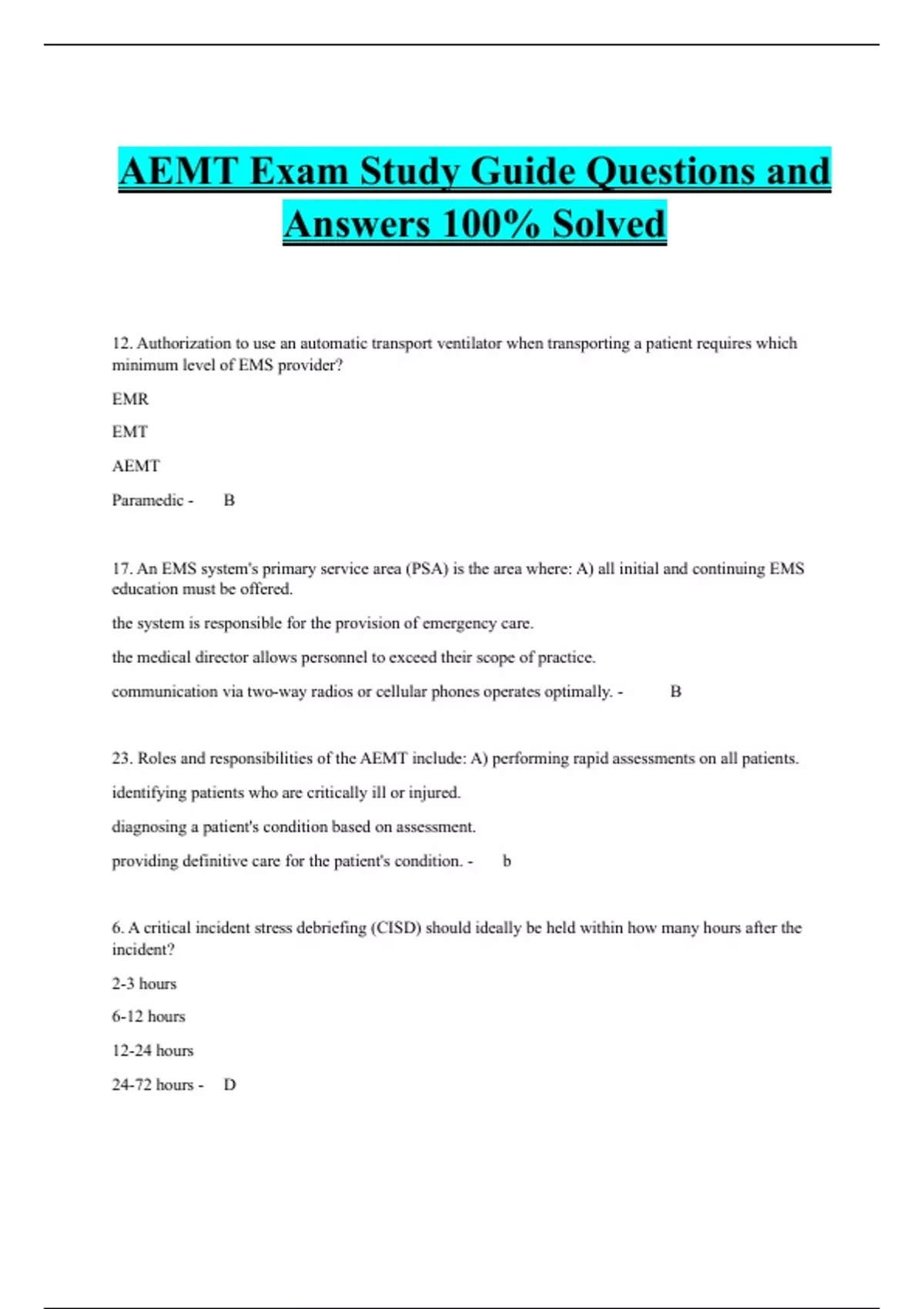 AEMT Exam Study Guide Questions and Answers 100% Solved 12. Authorization to use an automatic transport ventilator when transporting a patient requires which minimum level of EMS provider? EMR EMT AEMT Paramedic - B 17. An EMS system's primary service area (PSA) is the area where: A) all initial and continuing EMS education must be offered. the system is responsible for the provision of emergency care. the medical director allows personnel to exceed their scope of practice. communication via two-way radios or cellular phones operates optimally. - B 23. Roles and responsibilities of the AEMT include: A) performing rapid assessments on all patients. identifying patients who are critically ill or injured. diagnosing a patient's condition based on assessment. providing definitive care for the patient's condition. - b