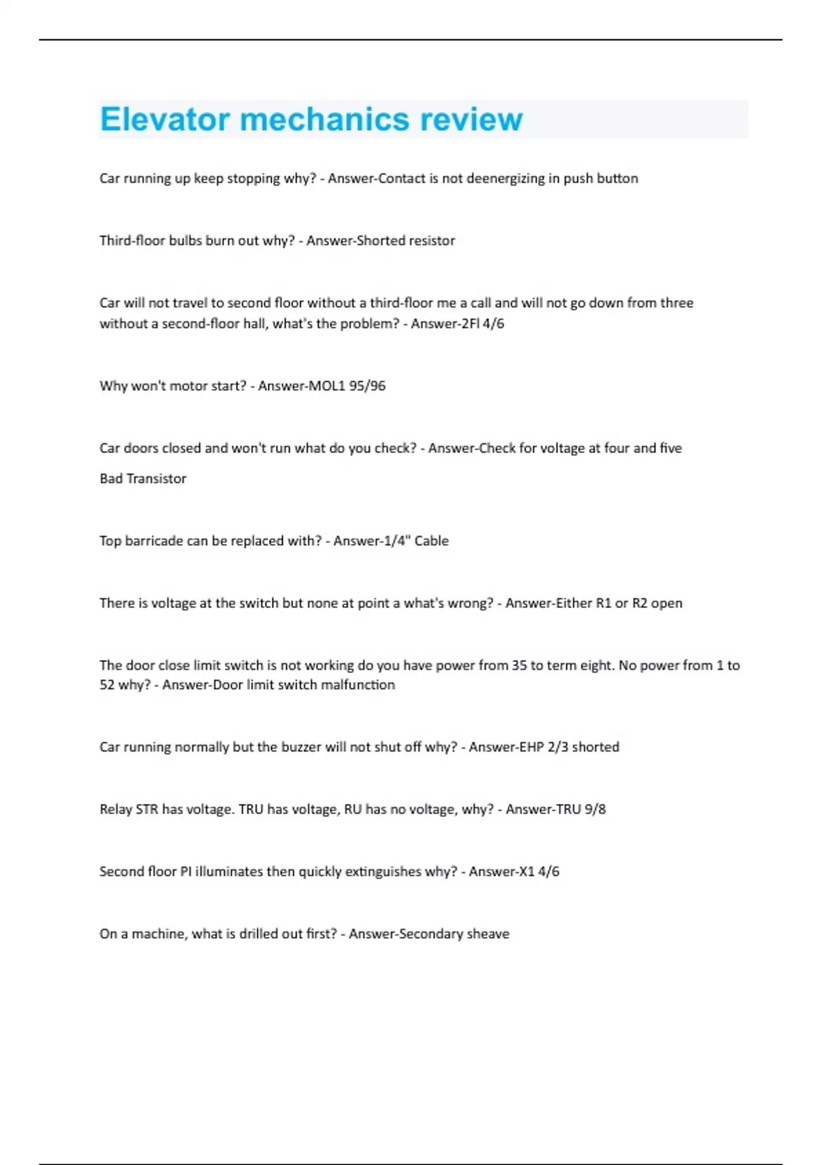 Car running up keep stopping why? - Answer-Contact is not deenergizing in push button Third-floor bulbs burn out why? - Answer-Shorted resistor Car will not travel to second floor without a third-floor me a call and will not go down from three without a second-floor hall, what's the problem? - Answer-2Fl 4/6 Why won't motor start? - Answer-MOL1 95/96 Car doors closed and won't run what do you check? - Answer-Check for voltage at four and five Bad Transistor Top barricade can be replaced with? - Answer-1/4" Cable There is voltage at the switch but none at point a what's wrong? - Answer-Either R1 or R2 open The door close limit switch is not working do you have power from 35 to term eight. No power from 1 to 52 why? - Answer-Door limit switch malfunction Car running normally but the buzzer will not shut off why? - Answer-EHP 2/3 shorted Relay STR has voltage. TRU has voltage, RU has no voltage, why? - Answer-TRU 9/8 Second floor PI illuminates then quickly extinguishes why? - Answer-X1 4/6 On a machine, what is drilled out first? - Answer-Secondary sheaveDumb waiter takes off before loading why? - Answer-Non interference Car levels in 3 inches high in down direction why? - Answer-Counterweight In bi-parting doors what gap is allowed before gate switch is open? - Answer-3/4" Pressure switch is wired in what direction - Answer-Down directional What is the tripping speed of counterweight governor? - Answer-No more than 10% higher There is excessive sparking on generator why? - Answer-High Micha How does interpoles affect the Armature? - Answer-Reaction What is the maximum door closing force? - Answer-30 lbs and 7 lbs kinetic What do you do before replacing a relay on a controller? - Answer-LOTO, Test, and Verify When are spring buffers used? - Answer-Less than 200fpm What are SCR's good for? - Answer-They are quieter and make less vibration then motor generator set You have a 200 ohm resistor at 200 Watts what do you replace it with? - Answer-75 ohm 200 watt adjustable resistor Pump overload keeps tripping. How do you measure amperage? - Answer-Clamp on meter separately each wire Customer complains about a third floor PI bulb burned out, why? - Answer-Shorted resistorThere are three elevators, 12 floors, customer does not want PI's on second, seventh, and eighth floor. How many total PI 's? - Answer-27 PI's 10k ohm resistor with 500mF. How long will it take to charge capacitor? - Answer-5 sec What do you do before running a Hydro after car is built? - Answer-Check piston for debris and make sure head is tight How to tell which side is right or left hand doors? - Answer-Inside looking out If you get a complaint that all floors make noise, what should you check? - Answer-Car doors What is the issue if you add power to a generator but the motor doesn't gain any more speed? - AnswerGenerator is saturated If a handrail switch is tripped and you reset it but the escalator immediately turns back on, what's the problem? - Answer-Start switch is stuck in the on position How many Crosbys do you use on half inch rope - Answer-3 What do U grooves need? - Answer-Double wrap What do you hold machine beams down with? - Answer-Tie downs When working on a PC board, what must you do? - Answer-Grounded wristband What is the boom out signal? - Answer-Arms out, thumbs out If there is high screeching, what should you check? - Answer-SCR driveWhat do you install first on a running platform? - Answer-Governor You have 52 traveling cables terminating in the controller how many total wires do you need? - Answer- 58 If rigging a motor into overhead, what type of rigging to prevent it from spinning? - Answer-Tagline, hoisting jack To run a freight car bi-parting doors must be? - Answer-Closed and locked Lula clearance per code? - Answer-3/4" A circuit that has permitted the elevator bypass up calls as the elevator travels down and vice versa? - Answer-Selective collective control How many millimeters in 1 inch? - Answer-25.4 What drawings are for physical components? - Answer-Final layout Relieve pressure on a Hydro? - Answer-150% of working pressure What is the strongest type of rope? - Answer-Seale rope You do a buffer test, what is acceptable time for it to retract? - Answer-60 sec What do you use to keep a machine from moving side to side? - Answer-Kick angle What is one of the first things you would do when doing a re-pack? - Answer-Pit stands, check cylinder for nicks and scratchesAt what degree are two leg bridal hitches most safe? - Answer-60° You are using a 4K lbs capacity hoist with a 4:1 set up, What's the max you can lift? - Answer-16K Governor tripping speed? - Answer-115% mechanical, electrical 10% less Hoist has no data tag, what do you do? - Answer-Remove from service