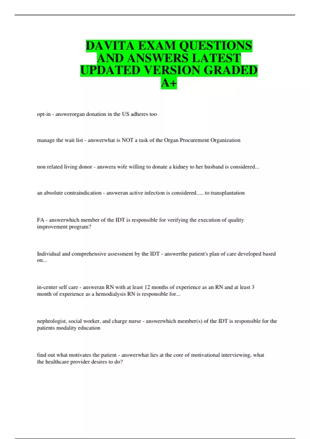DAVITA EXAM QUESTIONS AND ANSWERS LATEST UPDATED VERSION GRADED A+ opt-in - answerorgan donation in the US adheres too manage the wait list - answerwhat is NOT a task of the Organ Procurement Organization non related living donor - answera wife willing to donate a kidney to her husband is considered... an absolute contraindication - answeran active infection is considered..... to transplantation FA - answerwhich member of the IDT is responsible for verifying the execution of quality improvement program? Individual and comprehensive assessment by the IDT - answerthe patient's plan of care developed based on... in-center self care - answeran RN with at least 12 months of experience as an RN and at least 3 month of experience as a hemodialysis RN is responsible for... nephrologist, social worker, and charge nurse - answerwhich member(s) of the IDT is responsible for the patients modality education