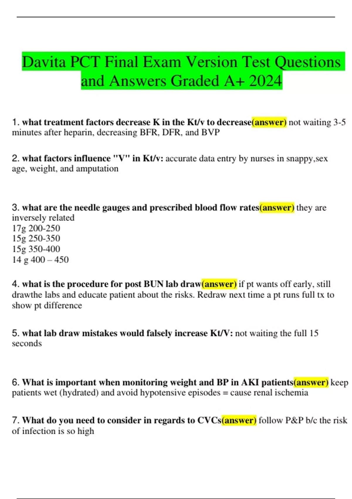 Davita PCT Final Exam Version Test Questions and Answers Graded A+ 2024 1. what treatment factors decrease K in the Kt/v to decrease(answer) not waiting 3-5 minutes after heparin, decreasing BFR, DFR, and BVP 2. what factors influence "V" in Kt/v: accurate data entry by nurses in snappy,sex age, weight, and amputation 3. what are the needle gauges and prescribed blood flow rates(answer) they are inversely related 17g 200-250 15g 250-350 15g 350-400 14 g 400 – 450 4. what is the procedure for post BUN lab draw(answer) if pt wants off early, still drawthe labs and educate patient about the risks. Redraw next time a pt runs full tx to show pt difference 5. what lab draw mistakes would falsely increase Kt/V: not waiting the full 15 seconds 6. What is important when monitoring weight and BP in AKI patients(answer) keep patients wet (hydrated) and avoid hypotensive episodes = cause renal ischemia