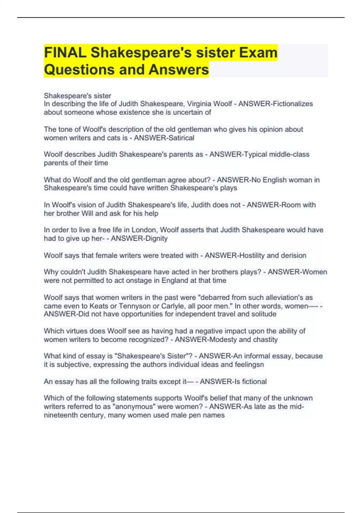 Shakespeare's sister In describing the life of Judith Shakespeare, Virginia Woolf - ANSWER-Fictionalizes about someone whose existence she is uncertain of The tone of Woolf's description of the old gentleman who gives his opinion about women writers and cats is - ANSWER-Satirical Woolf describes Judith Shakespeare's parents as - ANSWER-Typical middle-class parents of their time What do Woolf and the old gentleman agree about? - ANSWER-No English woman in Shakespeare's time could have written Shakespeare's plays In Woolf's vision of Judith Shakespeare's life, Judith does not - ANSWER-Room with her brother Will and ask for his help In order to live a free life in London, Woolf asserts that Judith Shakespeare would have had to give up her- - ANSWER-Dignity Woolf says that female writers were treated with - ANSWER-Hostility and derision Why couldn't Judith Shakespeare have acted in her brothers plays? - ANSWER-Women were not permitted to act onstage in England at that time Woolf says that women writers in the past were "debarred from such alleviation's as came even to Keats or Tennyson or Carlyle, all poor men." In other words, women—- - ANSWER-Did not have opportunities for independent travel and solitude Which virtues does Woolf see as having had a negative impact upon the ability of women writers to become recognized? - ANSWER-Modesty and chastity What kind of essay is "Shakespeare's Sister"? - ANSWER-An informal essay, because it is subjective, expressing the authors individual ideas and feelingsn An essay has all the following traits except it— - ANSWER-Is fictional Which of the following statements supports Woolf's belief that many of the unknown writers referred to as "anonymous" were women? - ANSWER-As late as the mid-nineteenth century, many women used male pen names