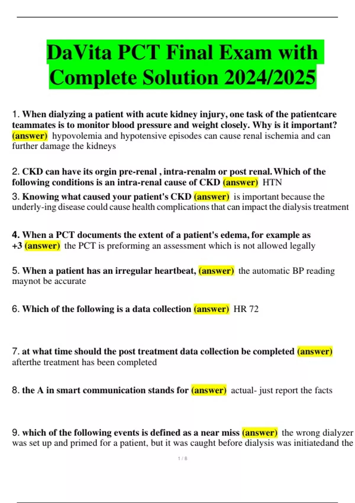 DaVita PCT Final Exam with Complete Solution 2024/2025 1. When dialyzing a patient with acute kidney injury, one task of the patientcare teammates is to monitor blood pressure and weight closely. Why is it important? (answer) hypovolemia and hypotensive episodes can cause renal ischemia and can further damage the kidneys 2. CKD can have its orgin pre-renal , intra-renalm or post renal.Which of the following conditions is an intra-renal cause of CKD (answer) HTN 3. Knowing what caused your patient's CKD (answer) is important because the underly-ing disease could cause health complicationsthat can impact the dialysistreatment 4. When a PCT documents the extent of a patient's edema, for example as +3 (answer) the PCT is preforming an assessment which is not allowed legally 5. When a patient has an irregular heartbeat, (answer) the automatic BP reading maynot be accurate 6. Which of the following is a data collection (answer) HR 72 7. at what time should the post treatment data collection be completed (answer) afterthe treatment has been completed 8. the A in smart communication stands for (answer) actual- just report the facts
