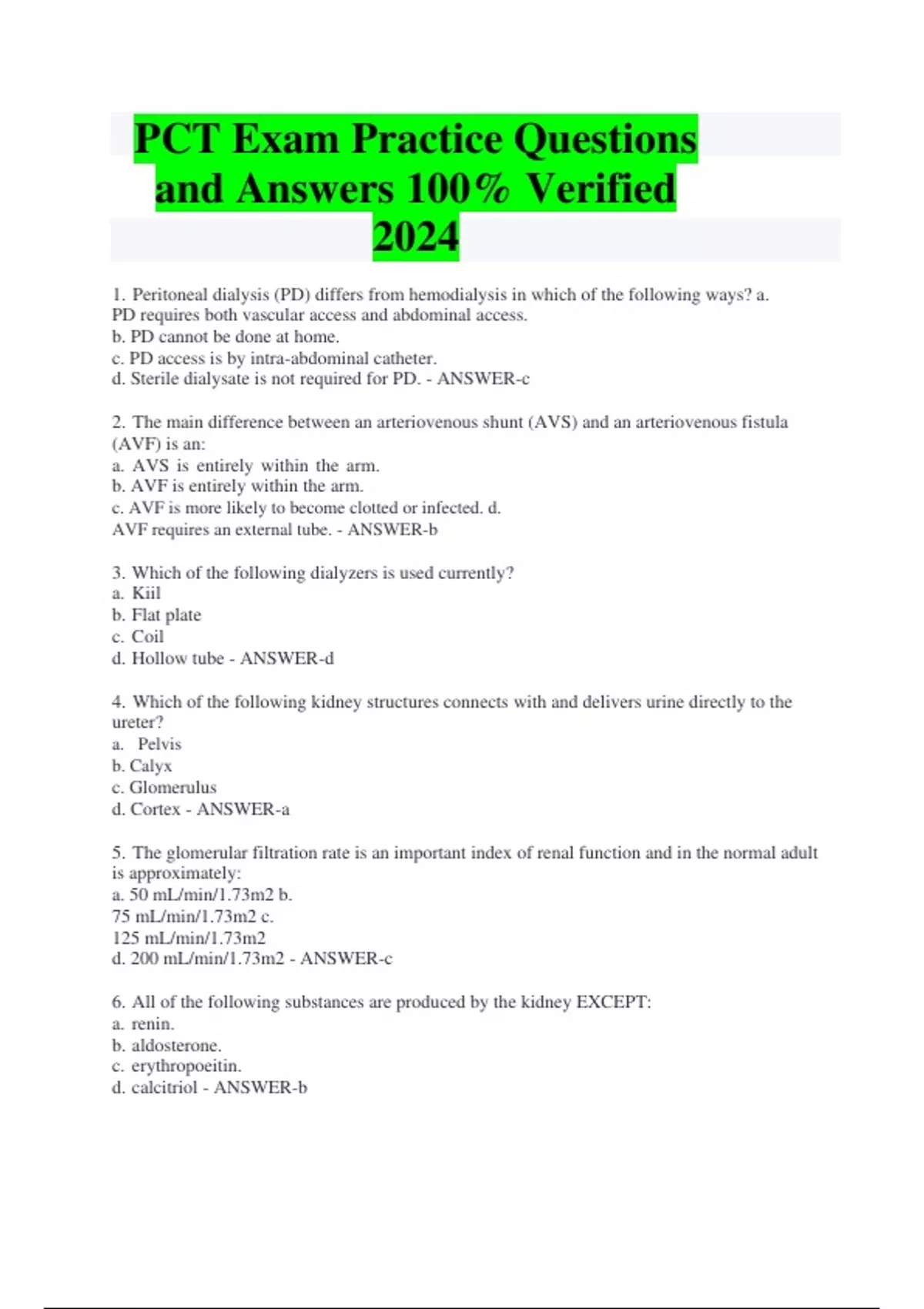 PCT Exam Practice Questions and Answers 100% Verified 2024 1. Peritoneal dialysis (PD) differs from hemodialysis in which of the following ways? a. PD requires both vascular access and abdominal access. b. PD cannot be done at home. c. PD access is by intra-abdominal catheter. d. Sterile dialysate is not required for PD. - ANSWER-c 2. The main difference between an arteriovenous shunt (AVS) and an arteriovenous fistula (AVF) is an: a. AVS is entirely within the arm. b. AVF is entirely within the arm. c. AVF is more likely to become clotted or infected. d. AVF requires an external tube. - ANSWER-b 3. Which of the following dialyzers is used currently? a. Kiil b. Flat plate c. Coil d. Hollow tube - ANSWER-d 4. Which of the following kidney structures connects with and delivers urine directly to the ureter? a. Pelvis b. Calyx c. Glomerulus d. Cortex - ANSWER-a 5. The glomerular filtration rate is an important index of renal function and in the normal adult is approximately: a. 50 mL/min/1.73m2 b. 75 mL/min/1.73m2 c. 125 mL/min/1.73m2 d. 200 mL/min/1.73m2 - ANSWER-c