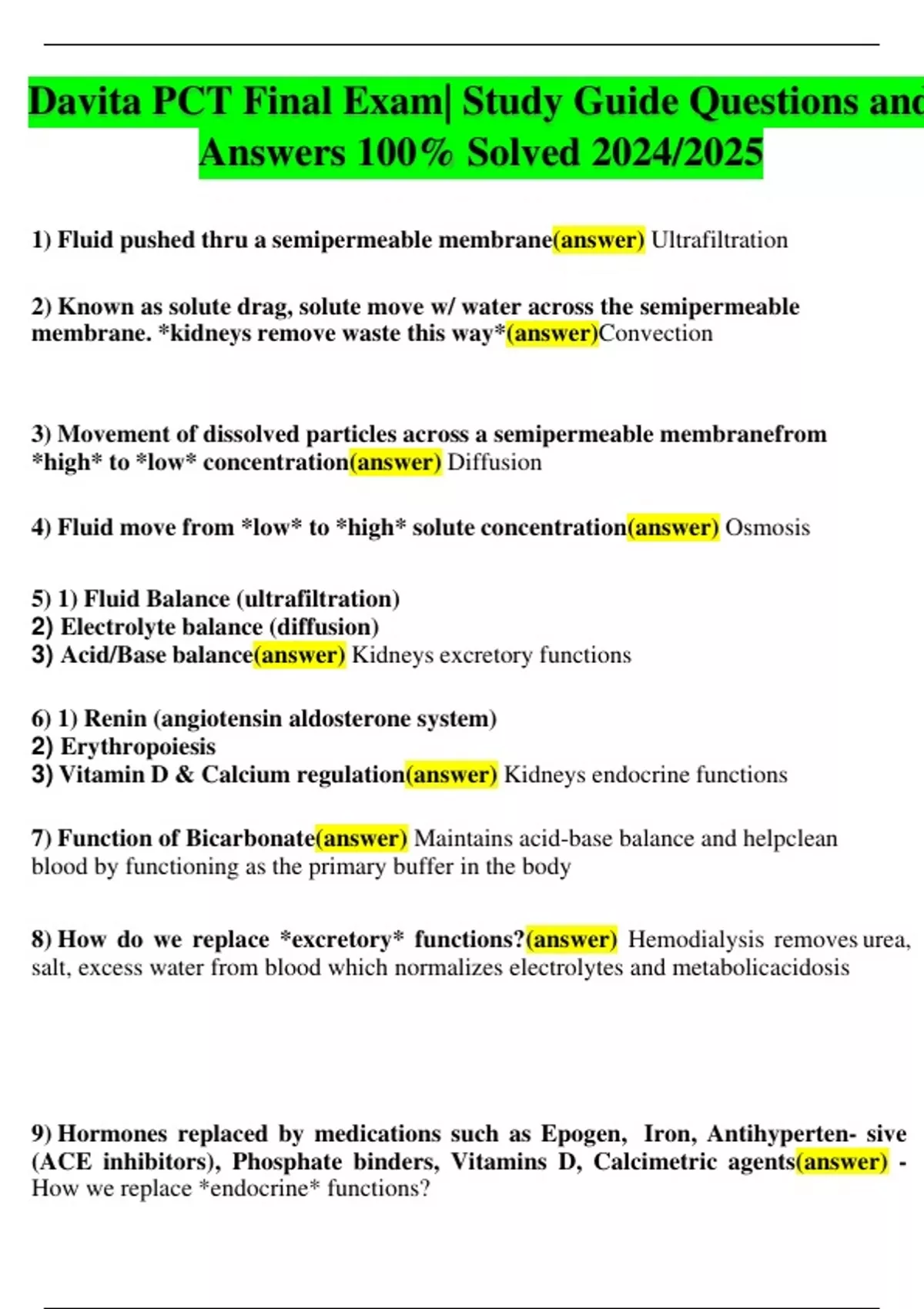 Davita PCT Final Exam| Study Guide Questions and Answers 100% Solved 2024/2025 1) Fluid pushed thru a semipermeable membrane(answer) Ultrafiltration 2) Known as solute drag, solute move w/ water across the semipermeable membrane. *kidneys remove waste this way*(answer)Convection 3) Movement of dissolved particles across a semipermeable membranefrom *high* to *low* concentration(answer) Diffusion 4) Fluid move from *low* to *high* solute concentration(answer) Osmosis 5) 1) Fluid Balance (ultrafiltration) 2) Electrolyte balance (diffusion) 3) Acid/Base balance(answer) Kidneys excretory functions 6) 1) Renin (angiotensin aldosterone system) 2) Erythropoiesis 3) Vitamin D & Calcium regulation(answer) Kidneys endocrine functions 7) Function of Bicarbonate(answer) Maintains acid-base balance and helpclean blood by functioning as the primary buffer in the body