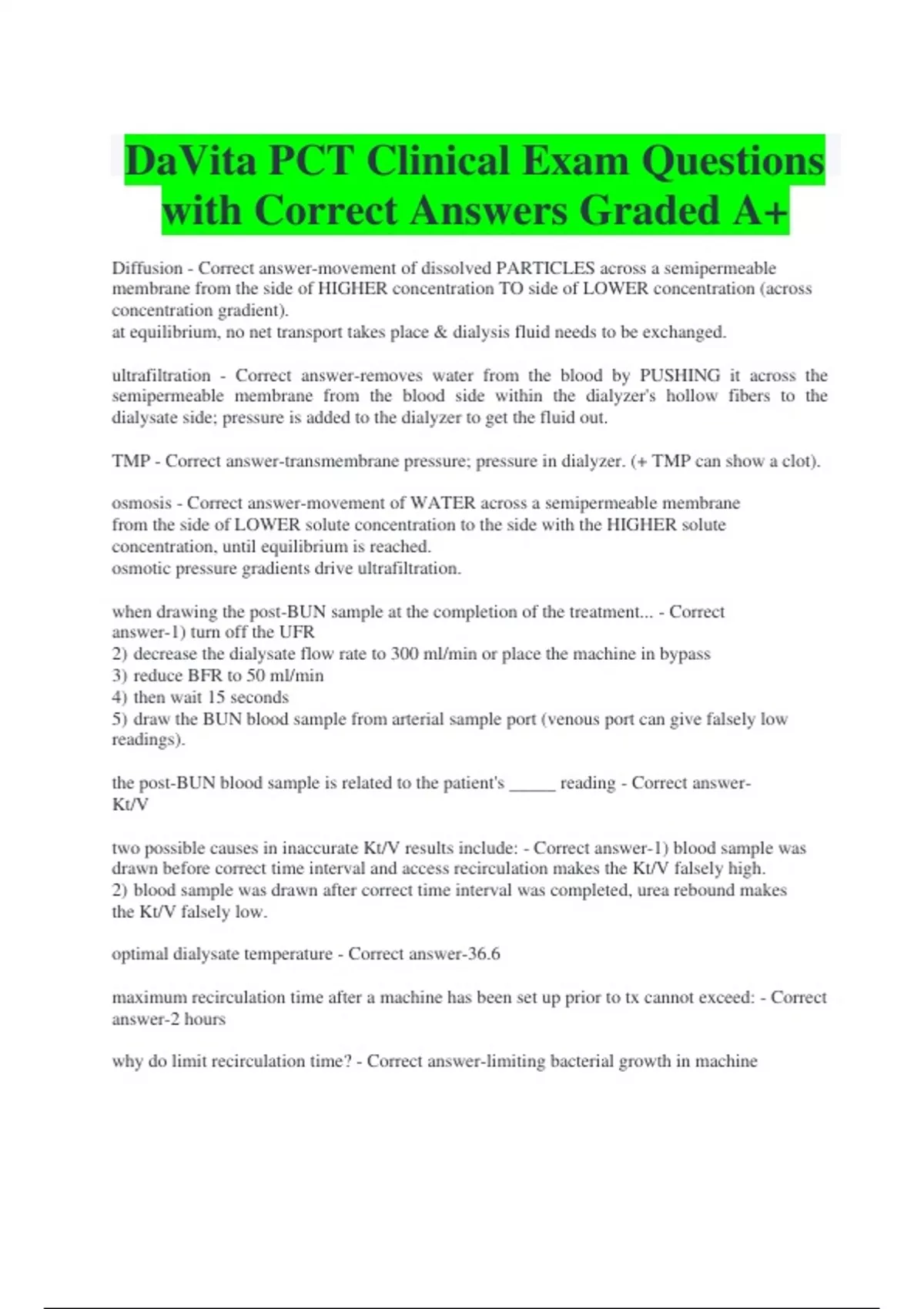 DaVita PCT Clinical Exam Questions with Correct Answers Graded A+ Diffusion - Correct answer-movement of dissolved PARTICLES across a semipermeable membrane from the side of HIGHER concentration TO side of LOWER concentration (across concentration gradient). at equilibrium, no net transport takes place & dialysis fluid needs to be exchanged. ultrafiltration - Correct answer-removes water from the blood by PUSHING it across the semipermeable membrane from the blood side within the dialyzer's hollow fibers to the dialysate side; pressure is added to the dialyzer to get the fluid out. TMP - Correct answer-transmembrane pressure; pressure in dialyzer. (+ TMP can show a clot). osmosis - Correct answer-movement of WATER across a semipermeable membrane from the side of LOWER solute concentration to the side with the HIGHER solute concentration, until equilibrium is reached. osmotic pressure gradients drive ultrafiltration. when drawing the post-BUN sample at the completion of the treatment... - Correct answer-1) turn off the UFR 2) decrease the dialysate flow rate to 300 ml/min or place the machine in bypass 3) reduce BFR to 50 ml/min 4) then wait 15 seconds 5) draw the BUN blood sample from arterial sample port (venous port can give falsely low readings). the post-BUN blood sample is related to the patient's _____ reading - Correct answerKt/V two possible causes in inaccurate Kt/V results include: - Correct answer-1) blood sample was drawn before correct time interval and access recirculation makes the Kt/V falsely high. 2) blood sample was drawn after correct time interval was completed, urea rebound makes the Kt/V falsely low. optimal dialysate temperature - Correct answer-36.6 maximum recirculation time after a machine has been set up prior to tx cannot exceed: - Correct answer-2 hours