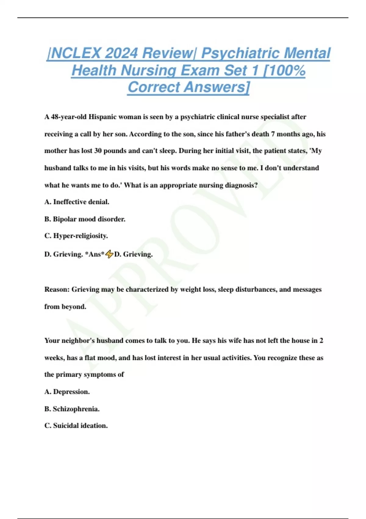 |NCLEX 2024 Review| Psychiatric Mental Health Nursing Exam Set 1 [100% Correct Answers] A 48-year-old Hispanic woman is seen by a psychiatric clinical nurse specialist after receiving a call by her son. According to the son, since his father's death 7 months ago, his mother has lost 30 pounds and can't sleep. During her initial visit, the patient states, 'My husband talks to me in his visits, but his words make no sense to me. I don't understand what he wants me to do.' What is an appropriate nursing diagnosis? A. Ineffective denial. B. Bipolar mood disorder. C. Hyper-religiosity. D. Grieving. *Ans* D. Grieving. Reason: Grieving may be characterized by weight loss, sleep disturbances, and messages from beyond. Your neighbor's husband comes to talk to you. He says his wife has not left the house in 2 weeks, has a flat mood, and has lost interest in her usual activities. You recognize these as the primary symptoms of A. Depression. B. Schizophrenia. C. Suicidal ideation. D. Bipolar manic episodes. *Ans* A. Depression. Reason: Depressed mood and anhedonia (loss of interest or pleasure in activities) are the primary symptoms of major depression. Your patient is ready for discharge after a 30-day hospitalization for manic depression. About 30 minutes before his discharge, his roommate comes to you and says, 'He is talking crazy.' When you ask your patient how he is feeling, he states, 'I feel like Superman. I can do anything. I can fly home today and then become a U.S. Senator.' Which type of maniarelated symptoms is this patient exhibiting? A. Social. B. Cognitive. C. Behavioral. D. Perceptual. *Ans* B. Cognitive. Reason: Cognitive symptoms include inflated self-esteem and grandiosity. You need to assess whether a patient who has a mood disorder is ready for discharge. Which statement would indicate readiness for discharge? A. Right now, I can't bathe myself or dress myself, but I feel good about that. B. Going home will be fun, but if it isn't fun, I can always make my mother help me or tell her to do so. She better help me