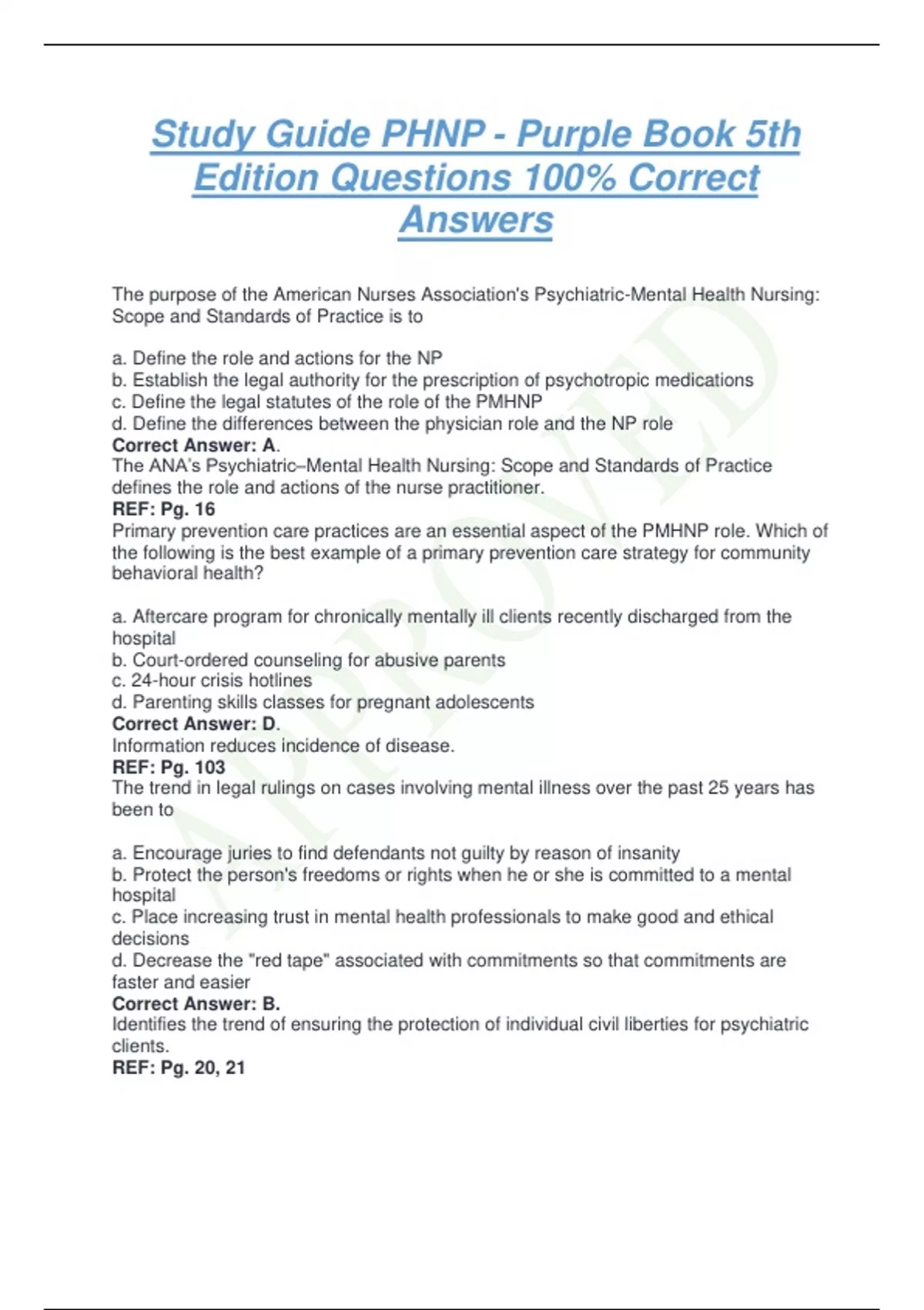 Study Guide PHNP - Purple Book 5th Edition Questions 100% Correct Answers The purpose of the American Nurses Association's Psychiatric-Mental Health Nursing: Scope and Standards of Practice is to a. Define the role and actions for the NP b. Establish the legal authority for the prescription of psychotropic medications c. Define the legal statutes of the role of the PMHNP d. Define the differences between the physician role and the NP role Correct Answer: A. The ANA’s Psychiatric–Mental Health Nursing: Scope and Standards of Practice defines the role and actions of the nurse practitioner. REF: Pg. 16 Primary prevention care practices are an essential aspect of the PMHNP role. Which of the following is the best example of a primary prevention care strategy for community behavioral health? a. Aftercare program for chronically mentally ill clients recently discharged from the hospital b. Court-ordered counseling for abusive parents c. 24-hour crisis hotlines d. Parenting skills classes for pregnant adolescents Correct Answer: D. Information reduces incidence of disease. REF: Pg. 103 The trend in legal rulings on cases involving mental illness over the past 25 years has been to a. Encourage juries to find defendants not guilty by reason of insanity b. Protect the person's freedoms or rights when he or she is committed to a mental hospital c. Place increasing trust in mental health professionals to make good and ethical decisions d. Decrease the "red tape" associated with commitments so that commitments are faster and easier Correct Answer: B. Identifies the trend of ensuring the protection of individual civil liberties for psychiatric clients. REF: Pg. 20, 21 Mr. Smithers, an involuntarily hospitalized patient experiencing psychotic symptoms, refuses to take any of his ordered medication because he believes "Jesus Christ told me I am the prophet and must fast for a year." Your actions should be based on your knowledge of which of the following? a. Psychiatric clients cannot refuse treatment b. Psychiatric clients do not always know what is good for them c. Psychiatric clients can refuse treatment d. Psychiatric clients cannot be trusted to make good healthcare decisions and, therefore, the nurse's best clinical judgment should guide actions Correct Answer: C. As with any client, psychiatric clients can refuse treatment un-less a legal process resulting in involuntary commitment or mandatory court order for treatment has been obtained. REF: Pg. 19, 31 Which of the following statements best reflects the difference between the nurse-client (N-C) relationship and a social relationship? a. In the N-C relationship, the primary focus is on the client and the client's needs. b. Goals in the N-C relationship are deliberately left vague and unspoken so that the client can work on any issue. c. In the N-C relationship, the nurse is solely responsible for making the relationship work. d. In the N-C relationship, there is no place for social interaction. Correct Answer: A. Social relationships are mutual interpersonal relationships in which the needs of both parties are addressed. The N–C relationship is most concerned with meeting the needs of the client. REF: Pg. 38 A community has an unusually high incidence of depression and drug use among the teen-age population. The public health nurses decide to address this problem, in part, by modifying the environment and strengthening the capacities of families to prevent the development of new cases of depression and drug use. What is this is an example of? a. Primary prevention b. Secondary prevention c. Tertiary prevention d. Protective factorial preventio