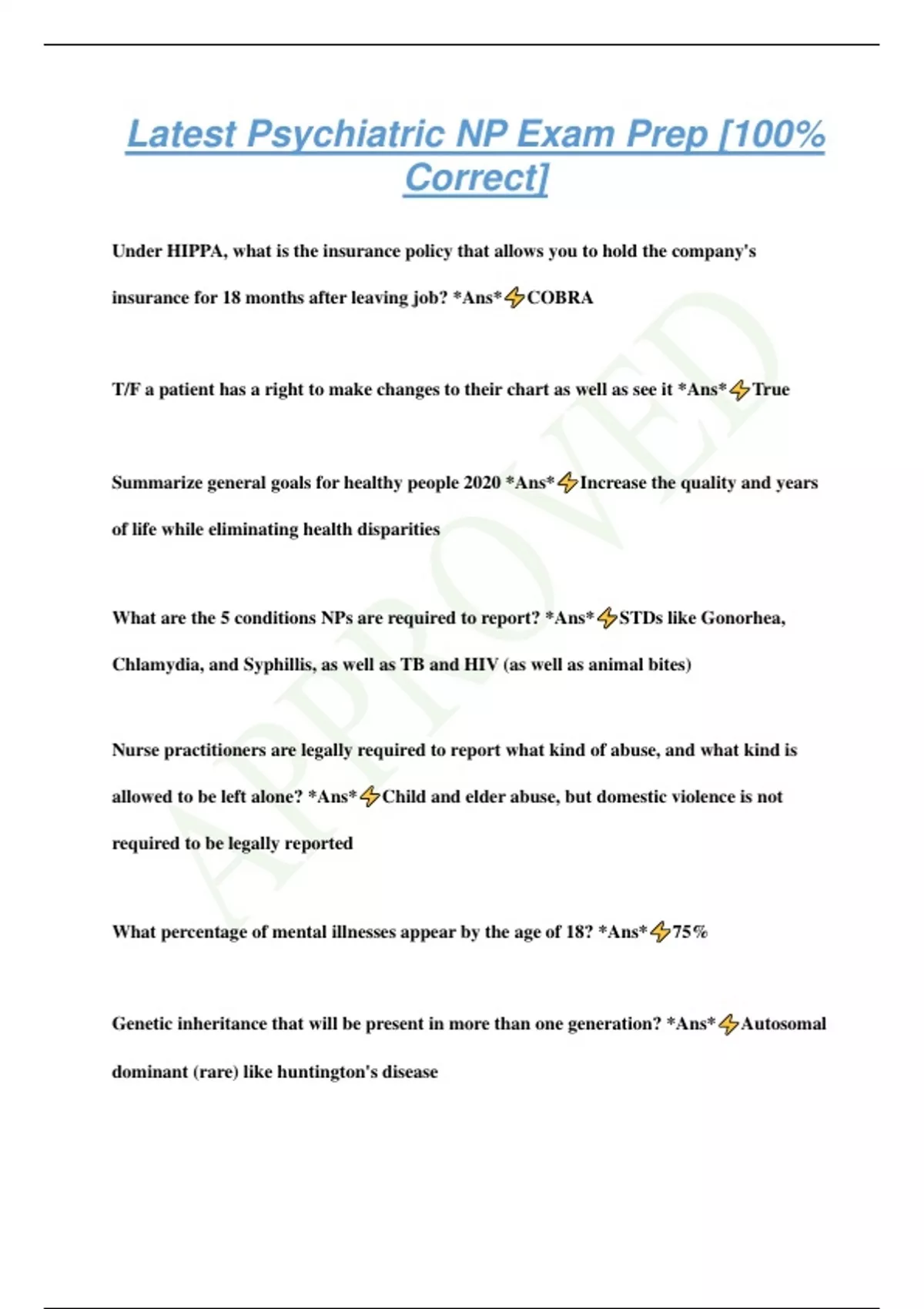 Latest Psychiatric NP Exam Prep [100% Correct] Under HIPPA, what is the insurance policy that allows you to hold the company's insurance for 18 months after leaving job? *Ans* COBRA T/F a patient has a right to make changes to their chart as well as see it *Ans* True Summarize general goals for healthy people 2020 *Ans* Increase the quality and years of life while eliminating health disparities What are the 5 conditions NPs are required to report? *Ans* STDs like Gonorhea, Chlamydia, and Syphillis, as well as TB and HIV (as well as animal bites) Nurse practitioners are legally required to report what kind of abuse, and what kind is allowed to be left alone? *Ans* Child and elder abuse, but domestic violence is not required to be legally reported What percentage of mental illnesses appear by the age of 18? *Ans* 75% Genetic inheritance that will be present in more than one generation? *Ans* Autosomal dominant (rare) like huntington's disease What is the difference between a normal grief response and a protracted grief response? *Ans* protractive grief response is a risk for pathology characterized by a loss of self esteem which does not happen with normal grief What is the rate of schizophrenia admissions to the hospital when both parents are infected by the illness? one parent? both bipolar? one bipolar? *Ans* almost 40%, 7%, almost 25% and almost 5% respectively. How would you treat someone who is psychotropic naive? *Ans* use lower doses due to no tolerance and no down regulation. When asking a patient about medical history during a psychiatric interview, what diseases should we pay particular attention to? Why? *Ans* Autoimmune conditions (possible use of steroids), metabolic syndrome like heart disease, hyperlipidemia, and diabetes. These can be made worse in the presence of psychiatric illness or vice versa. Describe normal patterns of sleep *Ans* Begin in Non-Rem (Stage 1), move into deeper non-rem or slow wave sleep (Stages 2-4), 1st stage of Rem sleep 80-100 minutes later and repeats with each REM stage lasting longer. What kind of sleep declines markedly with organic brain dysfunction and is sensitive to temperature extremes? *Ans* RE