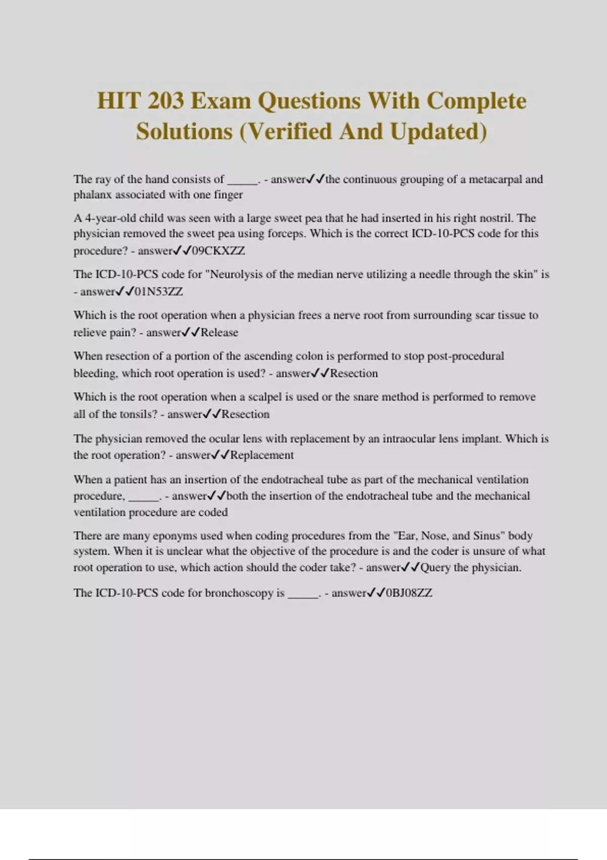 HIT 203 Exam Questions With Complete Solutions (Verified And Updated) The ray of the hand consists of _____. - answerthe continuous grouping of a metacarpal and phalanx associated with one finger A 4-year-old child was seen with a large sweet pea that he had inserted in his right nostril. The physician removed the sweet pea using forceps. Which is the correct ICD-10-PCS code for this procedure? - answer09CKXZZ The ICD-10-PCS code for "Neurolysis of the median nerve utilizing a needle through the skin" is - answer01N53ZZ Which is the root operation when a physician frees a nerve root from surrounding scar tissue to relieve pain? - answerRelease When resection of a portion of the ascending colon is performed to stop post-procedural bleeding, which root operation is used? - answerResection