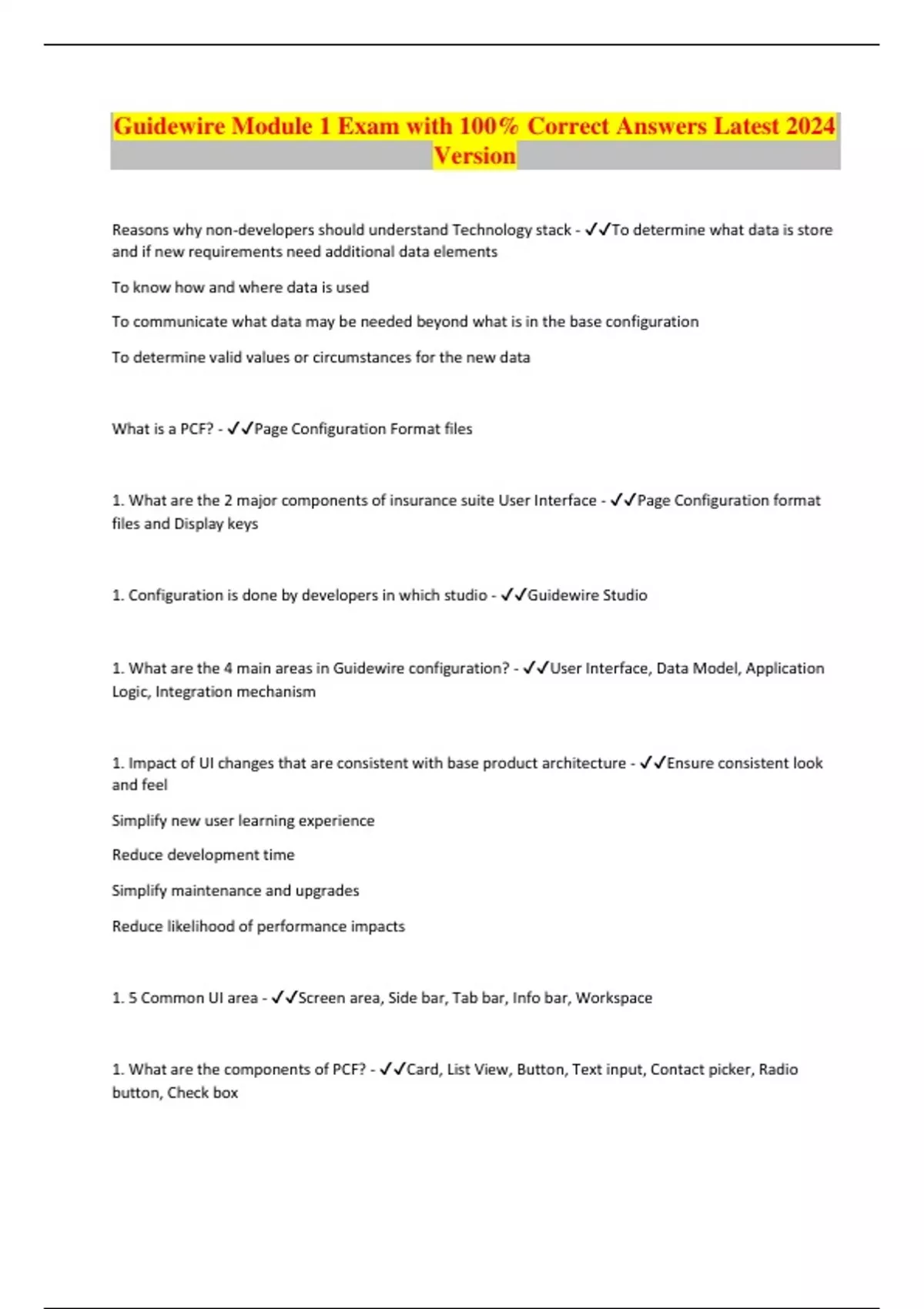 Guidewire Module 1 Exam with 100% Correct Answers Latest 2024 Version Reasons why non-developers should understand Technology stack - To determine what data is store and if new requirements need additional data elements To know how and where data is used To communicate what data may be needed beyond what is in the base configuration To determine valid values or circumstances for the new data What is a PCF? - Page Configuration Format files 1. What are the 2 major components of insurance suite User Interface - Page Configuration format files and Display keys 1. Configuration is done by developers in which studio - Guidewire Studio 1. What are the 4 main areas in Guidewire configuration? - User Interface, Data Model, Application Logic, Integration mechanism 1. Impact of UI changes that are consistent with base product architecture - Ensure consistent look and feel Simplify new user learning experience Reduce development time Simplify maintenance and upgrades Reduce likelihood of performance impacts