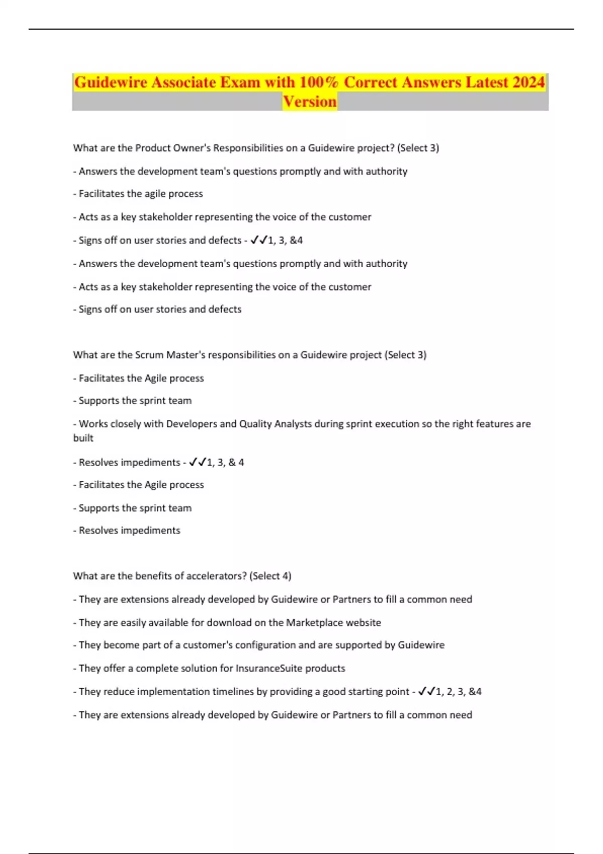 What are the Product Owner's Responsibilities on a Guidewire project? (Select 3) - Answers the development team's questions promptly and with authority - Facilitates the agile process - Acts as a key stakeholder representing the voice of the customer - Signs off on user stories and defects - 1, 3, &4 - Answers the development team's questions promptly and with authority - Acts as a key stakeholder representing the voice of the customer - Signs off on user stories and defects What are the Scrum Master's responsibilities on a Guidewire project (Select 3) - Facilitates the Agile process - Supports the sprint team - Works closely with Developers and Quality Analysts during sprint execution so the right features are built - Resolves impediments - 1, 3, & 4 - Facilitates the Agile process - Supports the sprint team - Resolves impediments What are the benefits of accelerators? (Select 4) - They are extensions already developed by Guidewire or Partners to fill a common need - They are easily available for download on the Marketplace website - They become part of a customer's configuration and are supported by Guidewire - They offer a complete solution for InsuranceSuite products - They reduce implementation timelines by providing a good starting point - 1, 2, 3, &4 - They are extensions already developed by Guidewire or Partners to fill a common need