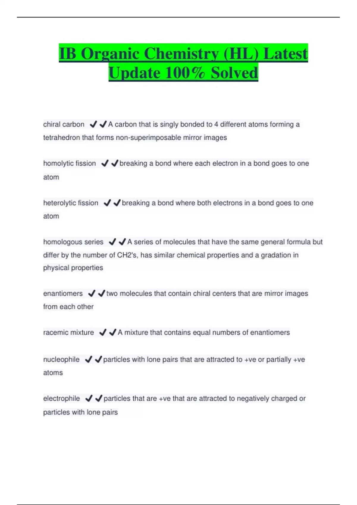 IB Organic Chemistry (HL) Latest Update 100% Solved chiral carbon ️️A carbon that is singly bonded to 4 different atoms forming a tetrahedron that forms non-superimposable mirror images homolytic fission ️️breaking a bond where each electron in a bond goes to one atom heterolytic fission ️️breaking a bond where both electrons in a bond goes to one atom homologous series ️️A series of molecules that have the same general formula but differ by the number of CH2's, has similar chemical properties and a gradation in physical properties enantiomers ️️two molecules that contain chiral centers that are mirror images from each other racemic mixture ️️A mixture that contains equal numbers of enantiomers nucleophile ️️particles with lone pairs that are attracted to +ve or partially +ve atoms