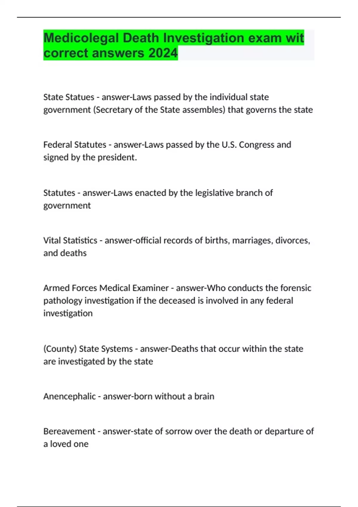 State Statues - answer-Laws passed by the individual state government (Secretary of the State assembles) that governs the state Federal Statutes - answer-Laws passed by the U.S. Congress and signed by the president. Statutes - answer-Laws enacted by the legislative branch of government Vital Statistics - answer-official records of births, marriages, divorces, and deaths Armed Forces Medical Examiner - answer-Who conducts the forensic pathology investigation if the deceased is involved in any federal investigation (County) State Systems - answer-Deaths that occur within the state are investigated by the state Anencephalic - answer-born without a brain Bereavement - answer-state of sorrow over the death or departure of a loved one Brain death - answer-Final cessation of activity in the CNS, as indicated by a flat EEG or absence of cerebral blood flow for a predetermined amount of time Cardiac death - answer-Final cessation of activity in the cardiovascular system involving the heart and blood vessels Cessation - answer-Final stoppage of action Coroner - answer-Typically an elected official who decides weather a death occurred under circumstances that require an autopsy, either by law or to determine manner or cause of death. A coroner can determine the scope of an autopsy and who will perform it if the elected coroner is not qualified. Only Kansas, Louisiana, North Dakota and Ohio require that coroners be medical doctors. Jurisdiction - answer-The power of authority a court or office has over individuals or trauma Legal next-of-kin - answer-The person from whom the medicolegal death investigator must secure consent before initiating any procurement activity Medical examiner - answer-Usually a medical doctor, although not necessarily a highly trained pathologist. Like a coroner, a medical examiner decides weather a death occurred under circumstances that may require an autopsy and who will perform it if the medical examiner is not qualified. A medical examiner is usually appointed to the position and may have jurisdiction for a county, district or state. OPO (organ procurement organization) - answer-Agency responsible for identifying potential donors, obtaining convent and procuring organs Postmortem changes - answer-Alterations of the body following death, including decomposition and environmental resuscitative injuries Resuscitate - answer-to revive, bring back to consciousness or existence Verify - answer-Establish or confirm the accuracy of information or evidence through testimony Empathy - answer-the ability to understand and share the feelings of another Sympathy - answer-feelings of pity and sorrow for someone else's misfortune Orthodox Jews - answer-Object to autopsy. If needed, must be performed before sundown on the day the person died Muslim - answer-No official concern Jehovah's Witnesses - answer-Not opposed Catholic - answer-Not opposed Laotians (Hmong) - answer-Generally opposed Mexican Catholic - answer-Opposed, unless required by law Protestants/Christian Scientists - answer-Not opposed Native Americans - answer-Generally object to autopsy Antimortem blood sample - answer-Initial blood sample attained when the subject arrives to the hospitals emergency room, before additional diagnostic or therapeutic treatment is initiated Authorization - answer-official permission or approval granted by supervisor Confidential - answer-Revealed in confidence to be kept secret Cremation - answer-Reduction of a dead human body to inorganic bone fragments by intense heat in a specially designed chamber Demographic information - answer-Personal identifying and specific information regarding an individual's age, social security number, gender, age, address and so on Disinterment - answer-Opening of a grave and removal of a body for the purpose of reexamination or removal to another site Embalmer - answer-a person, properly licensed, who disinfects, preserves, or restores a dead human body Euphemism - answer-a mild or indirect word or expression substituted for one considered to be too harsh or blunt Funeral director - answer-A person properly licensed, engaged in, or conducting, or holding himself out as being engaged in: 1) preparing, other than by embalming, for the burial or disposition of dead human bodies; 2) maintaining or operating a funeral establishment for the preparation and disposition, or for the care of dead human bodies. Guardianship or power of attorney - answer-Legal authorization to act on another individual's behalf. This authority usually ceases after death so be sure to check the law in your state. Interrogation - answer-formal questioning by persons in authority, usually law enforcement Interview - answer-Formal face-to-face conversation between a reporter/medicolegal death investigator and a person from whom information is sought (witness) Media - answer-Any news agency and its representatives Objective report - answer-Report made in an independent and unbiased manner, without regard for personal attitudes rather thoughts Pathologist - answer-A physician trained in the identification and diagnosis of disease and injury who may perform autopsies Pedigree - answer-List of ancestors on a person's family tree The public - answer-Any person or agency not officially affiliated with or recognized as a member of your office Religious objection - answer-A family's objection to the performance of an autopsy based on their religious beliefs Retort - answer-A vessel or chamber in which substances are decomposed by heat (cremation) Self-inflicted - answer-Infliction of injury or death on oneself Statutory - answer-Authorized by law Clandestine - answer-(adj.) secret, concealed; underhanded Autoeroticism - answer-sexual self-stimulation; for example, masturbation involving asphyxia to heighten sexual pleasure Hold-harness agreement - answer-A signed agreement or contract in which the signing parties agree not to file action for any injuries against the receiving party that might aris