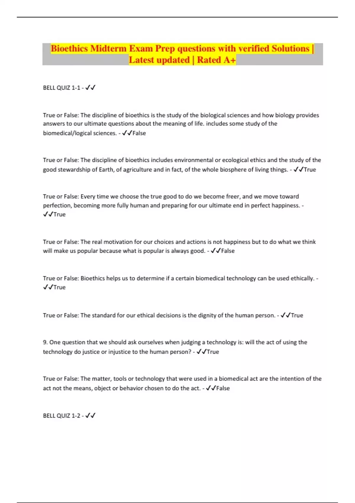 BELL QUIZ 1-1 - True or False: The discipline of bioethics is the study of the biological sciences and how biology provides answers to our ultimate questions about the meaning of life. includes some study of the biomedical/logical sciences. - False True or False: The discipline of bioethics includes environmental or ecological ethics and the study of the good stewardship of Earth, of agriculture and in fact, of the whole biosphere of living things. - True True or False: Every time we choose the true good to do we become freer, and we move toward perfection, becoming more fully human and preparing for our ultimate end in perfect happiness. - True True or False: The real motivation for our choices and actions is not happiness but to do what we think will make us popular because what is popular is always good. - False True or False: Bioethics helps us to determine if a certain biomedical technology can be used ethically. - True True or False: The standard for our ethical decisions is the dignity of the human person. - True 9. One question that we should ask ourselves when judging a technology is: will the act of using the technology do justice or injustice to the human person? - True True or False: The matter, tools or technology that were used in a biomedical act are the intention of the act not the means, object or behavior chosen to do the act. - False BELL QUIZ 1-2 -