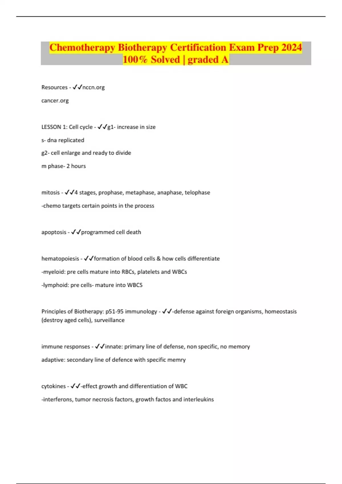 Resources - LESSON 1: Cell cycle - g1- increase in size s- dna replicated g2- cell enlarge and ready to divide m phase- 2 hours mitosis - 4 stages, prophase, metaphase, anaphase, telophase -chemo targets certain points in the process apoptosis - programmed cell death hematopoiesis - formation of blood cells & how cells differentiate -myeloid: pre cells mature into RBCs, platelets and WBCs -lymphoid: pre cells- mature into WBCS Principles of Biotherapy: p51-95 immunology - -defense against foreign organisms, homeostasis (destroy aged cells), surveillance immune responses - innate: primary line of defense, non specific, no memory adaptive: secondary line of defence with specific memry