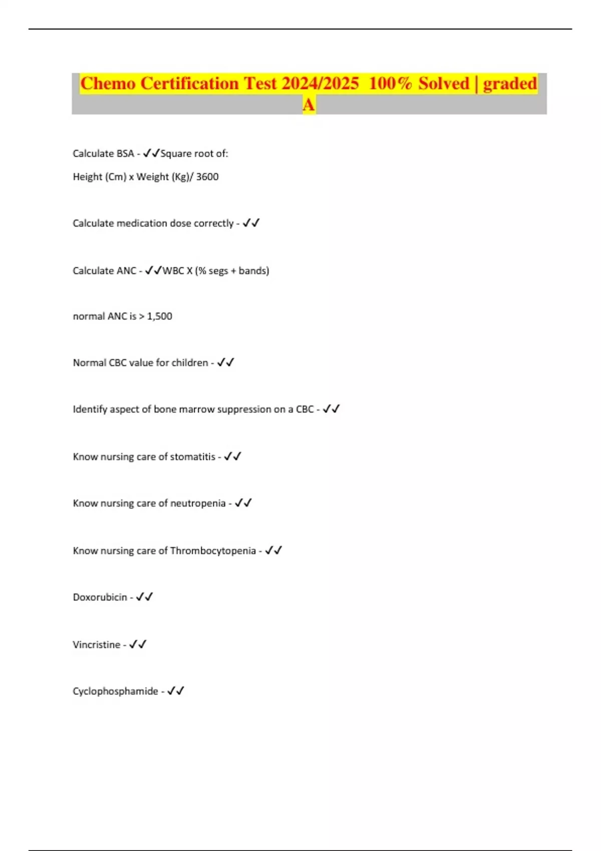 Calculate BSA - Square root of: Height (Cm) x Weight (Kg)/ 3600 Calculate medication dose correctly - Calculate ANC - WBC X (% segs + bands) normal ANC is 1,500 Normal CBC value for children - Identify aspect of bone marrow suppression on a CBC - Know nursing care of stomatitis - Know nursing care of neutropenia - Know nursing care of Thrombocytopenia - Doxorubicin - Vincristine - Cyclophosphamide -