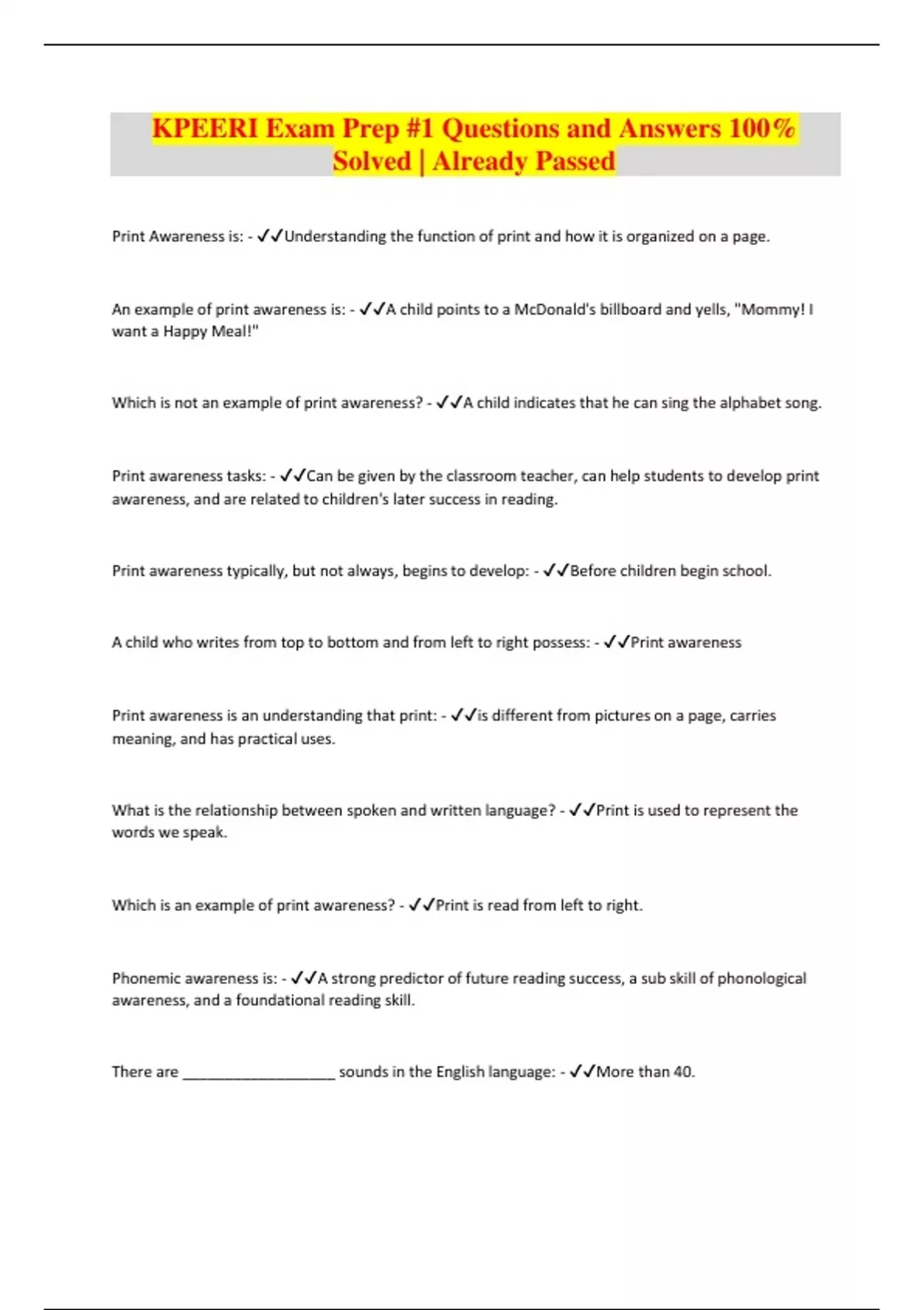 Print Awareness is: - Understanding the function of print and how it is organized on a page. An example of print awareness is: - A child points to a McDonald's billboard and yells, "Mommy! I want a Happy Meal!" Which is not an example of print awareness? - A child indicates that he can sing the alphabet song. Print awareness tasks: - Can be given by the classroom teacher, can help students to develop print awareness, and are related to children's later success in reading. Print awareness typically, but not always, begins to develop: - Before children begin school. A child who writes from top to bottom and from left to right possess: - Print awareness Print awareness is an understanding that print: - is different from pictures on a page, carries meaning, and has practical uses. What is the relationship between spoken and written language? - Print is used to represent the words we speak. Which is an example of print awareness? - Print is read from left to right. Phonemic awareness is: - A strong predictor of future reading success, a sub skill of phonological awareness, and a foundational reading skill. There are __________________ sounds in the English language: - More than 40.