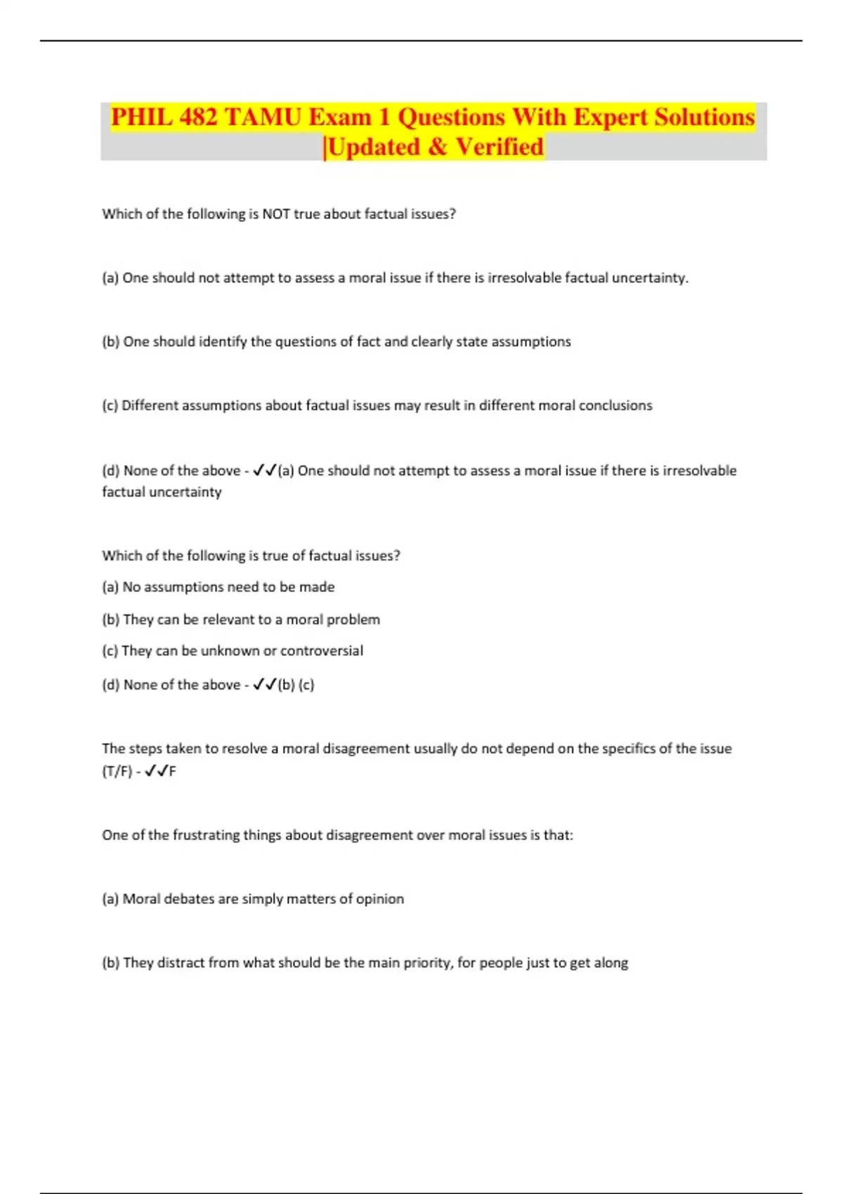 Which of the following is NOT true about factual issues? (a) One should not attempt to assess a moral issue if there is irresolvable factual uncertainty. (b) One should identify the questions of fact and clearly state assumptions (c) Different assumptions about factual issues may result in different moral conclusions (d) None of the above - (a) One should not attempt to assess a moral issue if there is irresolvable factual uncertainty Which of the following is true of factual issues? (a) No assumptions need to be made (b) They can be relevant to a moral problem (c) They can be unknown or controversial (d) None of the above - (b) (c)