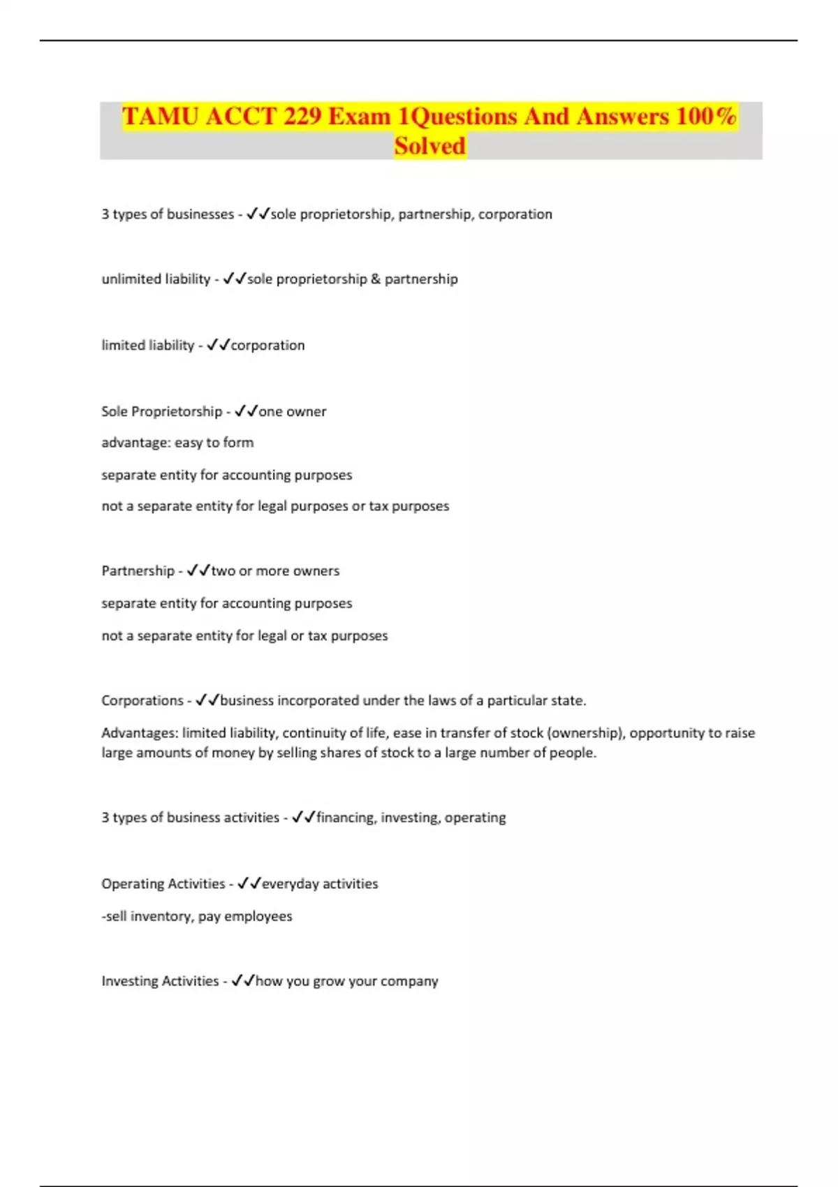 TAMU ACCT 229 Exam 1Questions And Answers 100% Solved 3 types of businesses - sole proprietorship, partnership, corporation unlimited liability - sole proprietorship & partnership limited liability - corporation Sole Proprietorship - one owner advantage: easy to form separate entity for accounting purposes not a separate entity for legal purposes or tax purposes Partnership - two or more owners separate entity for accounting purposes not a separate entity for legal or tax purposes Corporations - business incorporated under the laws of a particular state. Advantages: limited liability, continuity of life, ease in transfer of stock (ownership), opportunity to raise large amounts of money by selling shares of stock to a large number of people. 3 types of business activities - financing, investing, operating Operating Activities - everyday activities -sell inventory, pay employees