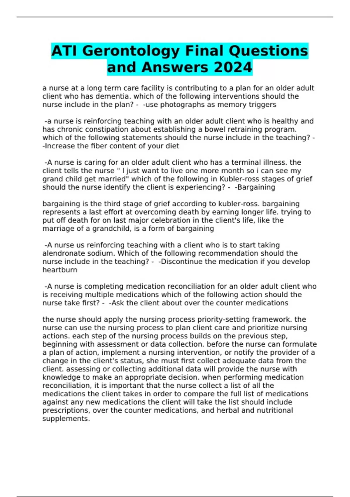 ATI Gerontology Final Questions and Answers 2024