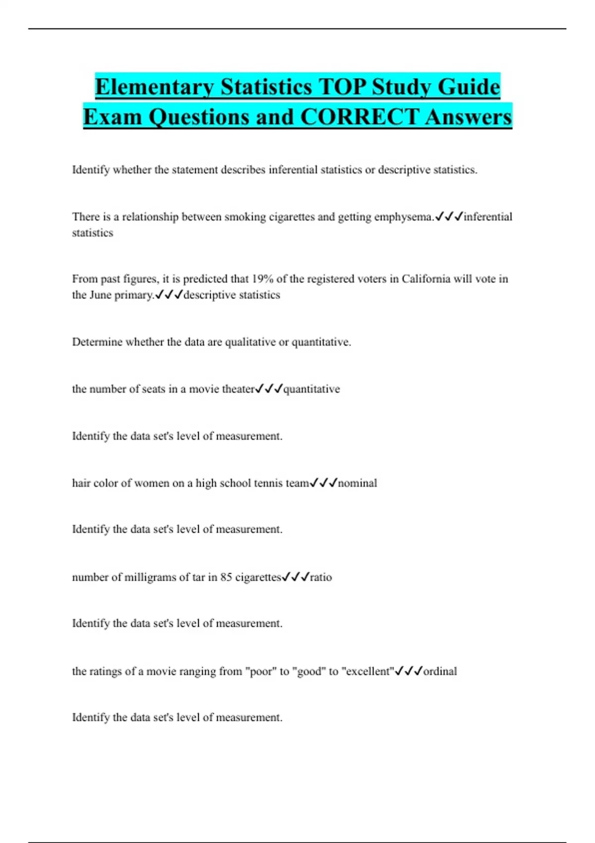 Elementary Statistics TOP Study Guide Exam Questions and CORRECT Answers