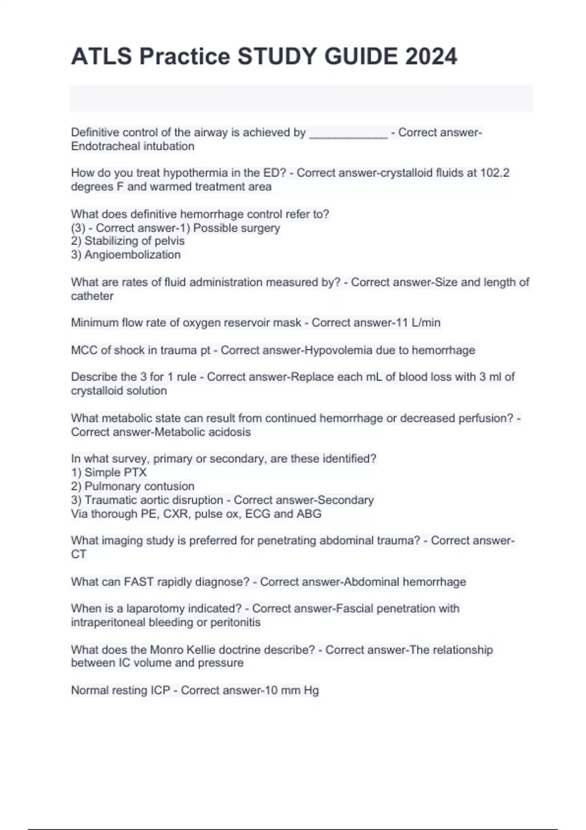 Definitive control of the airway is achieved by ____________ - Correct answerEndotracheal intubation How do you treat hypothermia in the ED? - Correct answer-crystalloid fluids at 102.2 degrees F and warmed treatment area What does definitive hemorrhage control refer to? (3) - Correct answer-1) Possible surgery 2) Stabilizing of pelvis 3) Angioembolization What are rates of fluid administration measured by? - Correct answer-Size and length of catheter Minimum flow rate of oxygen reservoir mask - Correct answer-11 L/min MCC of shock in trauma pt - Correct answer-Hypovolemia due to hemorrhage Describe the 3 for 1 rule - Correct answer-Replace each mL of blood loss with 3 ml of crystalloid solution What metabolic state can result from continued hemorrhage or decreased perfusion? - Correct answer-Metabolic acidosis In what survey, primary or secondary, are these identified? 1) Simple PTX 2) Pulmonary contusion 3) Traumatic aortic disruption - Correct answer-Secondary Via thorough PE, CXR, pulse ox, ECG and ABG What imaging study is preferred for penetrating abdominal trauma? - Correct answerCT What can FAST rapidly diagnose? - Correct answer-Abdominal hemorrhage When is a laparotomy indicated? - Correct answer-Fascial penetration with intraperitoneal bleeding or peritonitis What does the Monro Kellie doctrine describe? - Correct answer-The relationship between IC volume and pressure Normal resting ICP - Correct answer-10 mm Hg How do you reduce elevated ICP? - Correct answer-Mannitol in a 20% solution How do you temporarily control pelvic hemorrhage and instability? - Correct answerInternal traction and external counter-pressure How do you initially manage major arterial injury? - Correct answer-Direct pressure and fluid resuscitation Full thickness burn - Correct answer-Third degree burn What is used to estimate the size and depth of burns? - Correct answer-Rule of 9's Head= 9% Each arm=9% Front Trunk= 18% Back Trunk= 18% Upper leg= 9% Lower leg= 9% What type of burns appear wet and blistered? - Correct answer-Partial thickness burns (second degree) How do you treat CO exposed pt? - Correct answer-100% oxygen flow through non rebreather mask What is a reliable measure of circulating blood volumes in burn patients? - Correct answer-Hourly urine output *Goal= 0.5-1.0 ml/kg body weight* Hospital admission criteria for burn pt (8) - Correct answer-1) Partial-thickness burns greater than 10% total BSA (TBSA) 2) Full-thickness burns greater than 2% TBSA 3) Burns involving the face, hands, genitalia, perineum, or major joints 4) Circumferential extremity burns 5) All high-voltage electrical burns, including lightning injury--Admission of low-voltage electrical burns is selective 6) Chemical burns 7) Inhalation injury 8) Burn injuries in patients with preexisting medical disorders that could complicate management, prolong recovery, or affect mortality (eg, diabetes, immunosuppression) Parkland Formula for Fluid Resuscitation in Burn pt - Correct answer-3-4 mL Ringer lactate X weight (kg) X %TBSA burned (second-degree and third degree); *half administered over the first 8 hours* (from time of injury),* remaining half administered over the next 16 hours*