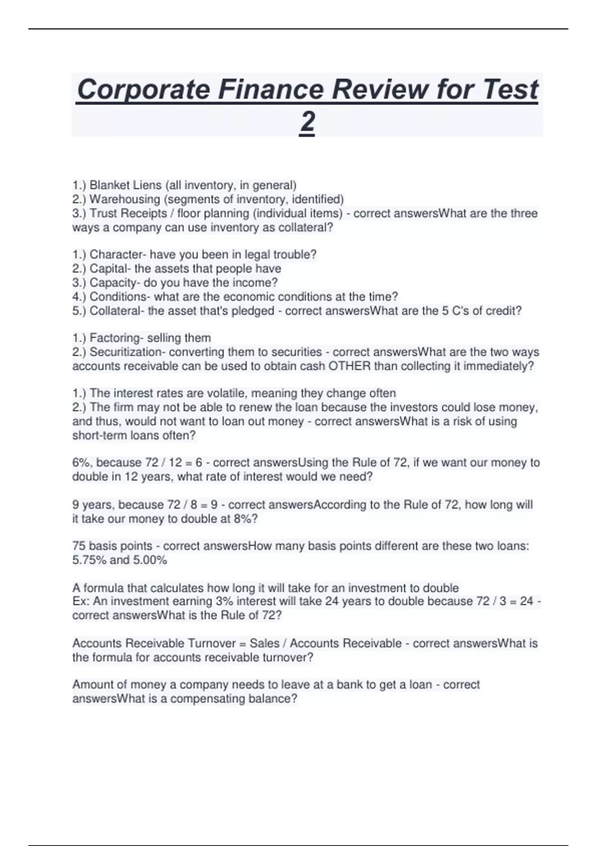 Corporate Finance Review for Test 2 1.) Blanket Liens (all inventory, in general) 2.) Warehousing (segments of inventory, identified) 3.) Trust Receipts / floor planning (individual items) - correct answersWhat are the three ways a company can use inventory as collateral? 1.) Character- have you been in legal trouble? 2.) Capital- the assets that people have 3.) Capacity- do you have the income? 4.) Conditions- what are the economic conditions at the time? 5.) Collateral- the asset that's pledged - correct answersWhat are the 5 C's of credit? 1.) Factoring- selling them 2.) Securitization- converting them to securities - correct answersWhat are the two ways accounts receivable can be used to obtain cash OTHER than collecting it immediately? 1.) The interest rates are volatile, meaning they change often 2.) The firm may not be able to renew the loan because the investors could lose money, and thus, would not want to loan out money - correct answersWhat is a risk of using short-term loans often? 6%, because 72 / 12 = 6 - correct answersUsing the Rule of 72, if we want our money to double in 12 years, what rate of interest would we need? 9 years, because 72 / 8 = 9 - correct answersAccording to the Rule of 72, how long will it take our money to double at 8%? 75 basis points - correct answersHow many basis points different are these two loans: 5.75% and 5.00% A formula that calculates how long it will take for an investment to double Ex: An investment earning 3% interest will take 24 years to double because 72 / 3 = 24 - correct answersWhat is the Rule of 72? Accounts Receivable Turnover = Sales / Accounts Receivable - correct answersWhat is the formula for accounts receivable turnover? Amount of money a company needs to leave at a bank to get a loan - correct answersWhat is a compensating balance