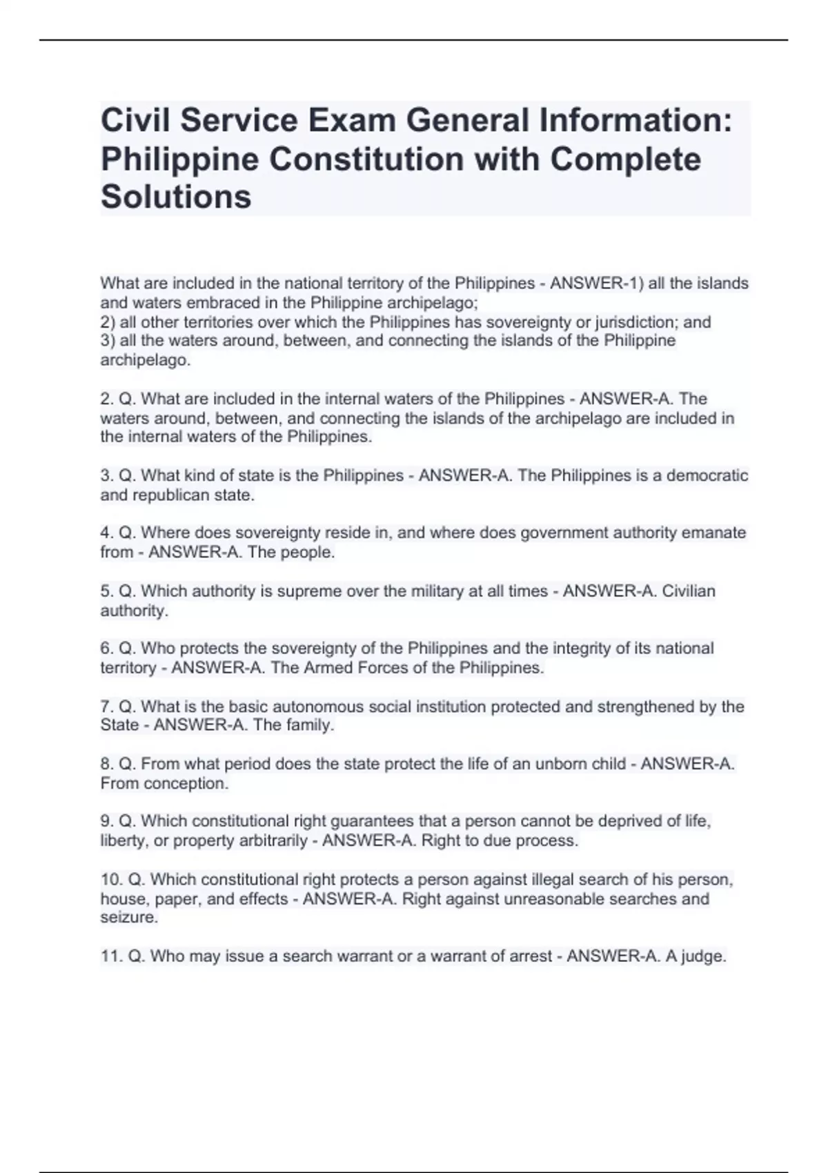 Civil Service Exam General Information: Philippine Constitution with Complete SolutionsCivil Service Exam General Information: Philippine Constitution with Complete SolutionsCivil Service Exam General Information: Philippine Constitution with Complete Solutions What are included in the national territory of the Philippines - ANSWER-1) all the islands and waters embraced in the Philippine archipelago; 2) all other territories over which the Philippines has sovereignty or jurisdiction; and 3) all the waters around, between, and connecting the islands of the Philippine archipelago. 2. Q. What are included in the internal waters of the Philippines - ANSWER-A. The waters around, between, and connecting the islands of the archipelago are included in the internal waters of the Philippines. 3. Q. What kind of state is the Philippines - ANSWER-A. The Philippines is a democratic and republican state. 4. Q. Where does sovereignty reside in, and where does government authority emanate from - ANSWER-A. The people.