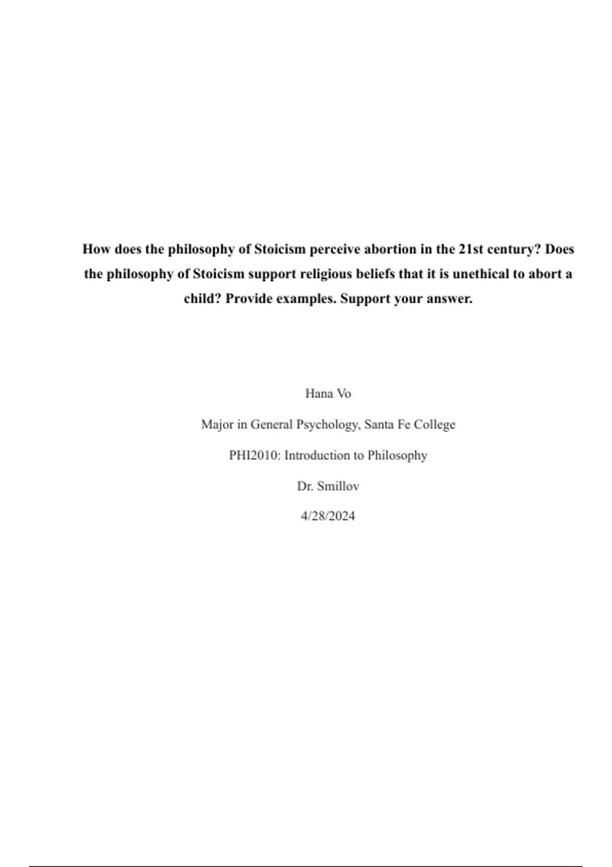 Introduction to Philosophy (PHI2010) Final Paper on Roman Stoicism, Ethics, Religion and Abortion.