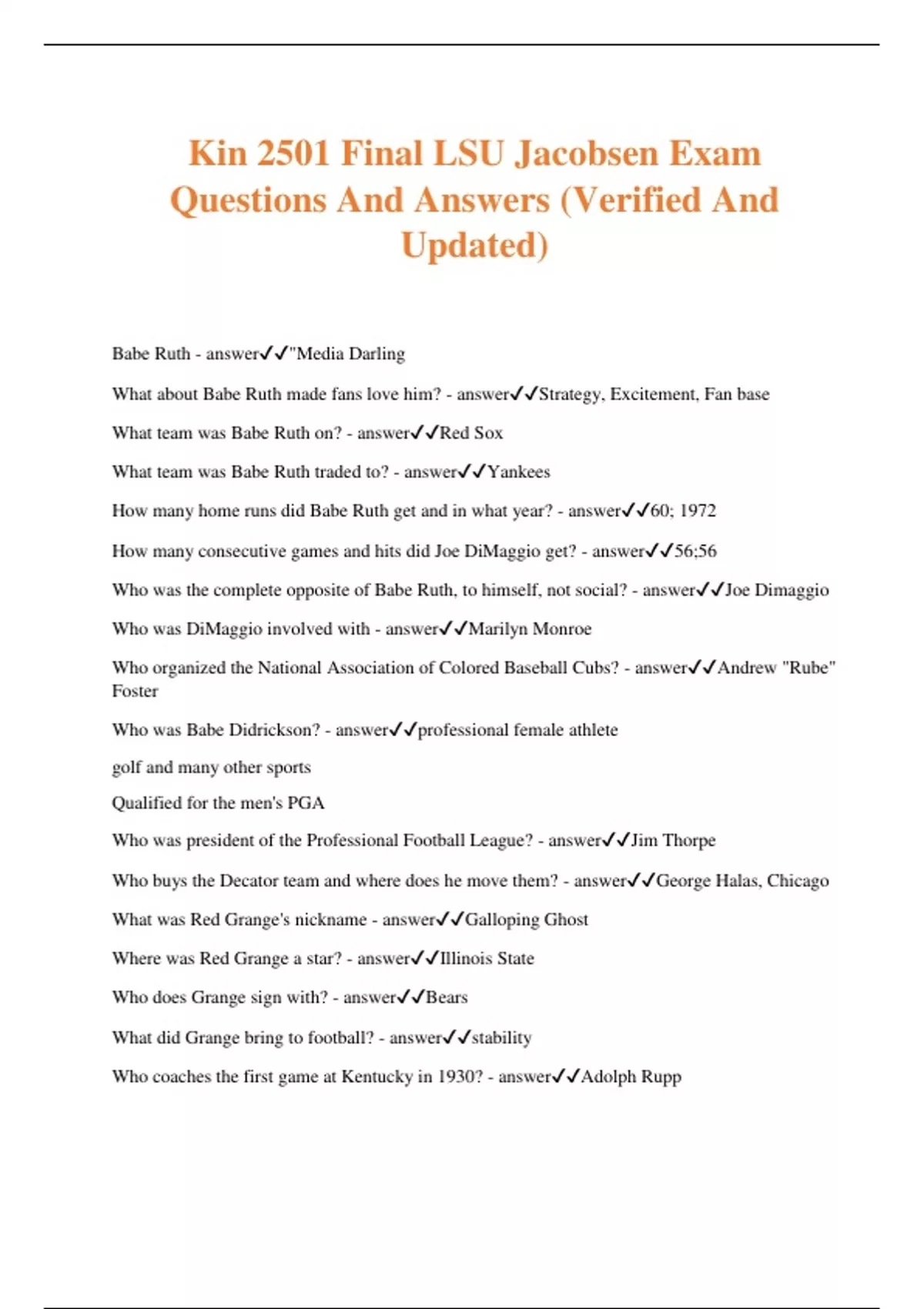 Kin 2501 Final LSU Jacobsen Exam Questions And Answers (Verified And Updated) Babe Ruth - answer"Media Darling What about Babe Ruth made fans love him? - answerStrategy, Excitement, Fan base What team was Babe Ruth on? - answerRed Sox What team was Babe Ruth traded to? - answerYankees How many home runs did Babe Ruth get and in what year? - answer60; 1972 How many consecutive games and hits did Joe DiMaggio get? - answer56;56 Who was the complete opposite of Babe Ruth, to himself, not social? - answerJoe Dimaggio Who was DiMaggio involved with - answerMarilyn Monroe Who organized the National Association of Colored Baseball Cubs? - answerAndrew "Rube" Foster Who was Babe Didrickson? - answerprofessional female athlete golf and many other sports Qualified for the men's PGA Who was president of the Professional Football League? - answerJim Thorpe Who buys the Decator team and where does he move them? - answerGeorge Halas, Chicago What was Red Grange's nickname - answerGalloping Ghost Where was Red Grange a star? - answerIllinois State Who does Grange sign with? - answerBears What did Grange bring to football? - answerstability Who coaches the first game at Kentucky in 1930? - answerAdolph Rupp What was special about Rupp's team? - answertempo and fast break style Who formed the Savory Big 5? - answerAbe Saperstein How did he get games? - answerRenames the team "New York" What does Abe rename them to and why? - answerHarlem Globe Trotters; To let people know they're a black team (draw a crowd) T/F They aren't considered the best barnstorming team. - answerFalse How many exhibition games did the Globe Trotters play and who did they play against? - answerGeorge Mikan's Minneapolis Lakers (NBA Champs); two exhibition games What was Joe Louis' nickname and what was he? - answerThe Brown Bomber; Heavy weight champ Reformers had a three year procedure that blened the working class & sport. What were some concerns? - answer1st step: humanitarian concerns - child labor laws (met with resistance from parents) 2nd step: passes mandatory education laws because unemployed children roamed the streets (joining gangs, crime) 3rd step: physical education in the schools; supervised games and sport taught deference to authority. What was the scandal where 8 White Sox received money to throw a game? - answerBlack Sox Scandal How did the black sox scandal affect baseball? - answerBaseball was getting tarnished bc of the gambling going on Baseball needed a commissioner to bring back the good name of baseball so who did they hire? - answerKennesaw Mountain Landis What was wrong with Landis and what did he do? - answerHe was racist and banned the 8 White Sox The commissioner had a lot of power from the beginning Beginning of the modern Olympics - answer1896 Where was the first modern Olympics held? - answerHeld in Athens, Greece Who was responsible for getting 1986 games going - answerPierre duCoubertin Pierre organized sports festival in ____ and after he was successful, he went to American and Europe to get people interested in games - answerFrance