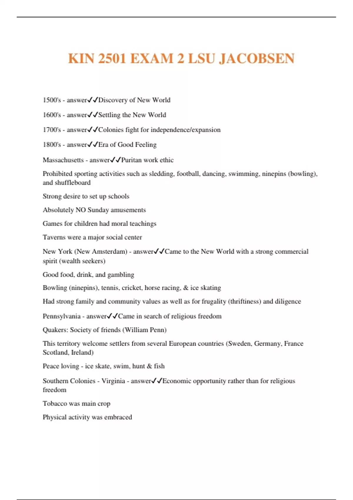 KIN 2501 EXAM 2 LSU JACOBSEN 1500's - answerDiscovery of New World 1600's - answerSettling the New World 1700's - answerColonies fight for independence/expansion 1800's - answerEra of Good Feeling Massachusetts - answerPuritan work ethic Prohibited sporting activities such as sledding, football, dancing, swimming, ninepins (bowling), and shuffleboard Strong desire to set up schools Absolutely NO Sunday amusements Games for children had moral teachings Taverns were a major social center New York (New Amsterdam) - answerCame to the New World with a strong commercial spirit (wealth seekers) Good food, drink, and gambling Bowling (ninepins), tennis, cricket, horse racing, & ice skating Had strong family and community values as well as for frugality (thriftiness) and diligence Pennsylvania - answerCame in search of religious freedom Quakers: Society of friends (William Penn) This territory welcome settlers from several European countries (Sweden, Germany, France Scotland, Ireland) Peace loving - ice skate, swim, hunt & fish Southern Colonies - Virginia - answerEconomic opportunity rather than for religious freedom Tobacco was main crop Physical activity was embraced
