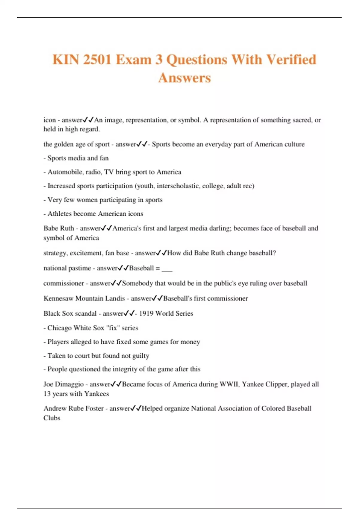 KIN 2501 Exam 3 Questions With Verified Answers icon - answerAn image, representation, or symbol. A representation of something sacred, or held in high regard. the golden age of sport - answer- Sports become an everyday part of American culture - Sports media and fan - Automobile, radio, TV bring sport to America - Increased sports participation (youth, interscholastic, college, adult rec) - Very few women participating in sports - Athletes become American icons Babe Ruth - answerAmerica's first and largest media darling; becomes face of baseball and symbol of America strategy, excitement, fan base - answerHow did Babe Ruth change baseball? national pastime - answerBaseball = ___ commissioner - answerSomebody that would be in the public's eye ruling over baseball Kennesaw Mountain Landis - answerBaseball's first commissioner Black Sox scandal - answer- 1919 World Series - Chicago White Sox "fix" series - Players alleged to have fixed some games for money - Taken to court but found not guilty - People questioned the integrity of the game after this Joe Dimaggio - answerBecame focus of America during WWII, Yankee Clipper, played all 13 years with Yankees Andrew Rube Foster - answerHelped organize National Association of Colored Baseball Clubs Andrew Rube Foster - answerFather of black baseball Josh Gibson - answerCatcher, very good hitter, compared to Babe Ruth Satchel Paige - answerVery good pitcher, tall and lanky, worked in a railroad station and when men got off the train he would carry their satchel in exchange for a nickel female sports in the early 1900's - answer- Few opportunities - Basketball, softball, tennis - Beliefs about "negative health implications" of vigorous PA for women - Female PE leaders discourage interscholastic and competitive sports for girls Babe Didrikson - answerThe most significant female athlete of the first half of the 20th century college - answerFootball is established as the ___ sport Rose - answer___ bowl was the first game in 1902 US military - answer___ evolve into football powers Notre Dame - answer___ becomes "America's team" forward pass - answerNotre Dame defeated the Army using the ___ Knute Rockne - answerPromotes Notre Dame via the press, later hired to coach at Notre Dame, tried to implement the forward pass (not many people used it because it was a high risk play) Jim Thorpe - answerPresident of American Professional Football League George Halas - answer___ buys Decator Illinois team, moves it to Chicago Red Grange - answerStars at the University of Illinois, best known college football player of the time, signed with the Bears, beginning of pro football legitimized basketball in the early 1900's - answer- Spread by the YMCA (so learned by kids) - Becomes associated with scholastic sport (high school sport) - By 1905, 80 colleges field teams basketball, 2nd - answerBy WWI, ___ is the most popular high school sport and ___ to football at the college level. Adolph Rupp - answer- Coaches 1st game at Kentucky - His teams wow crowds with up-tempo, fast break style.